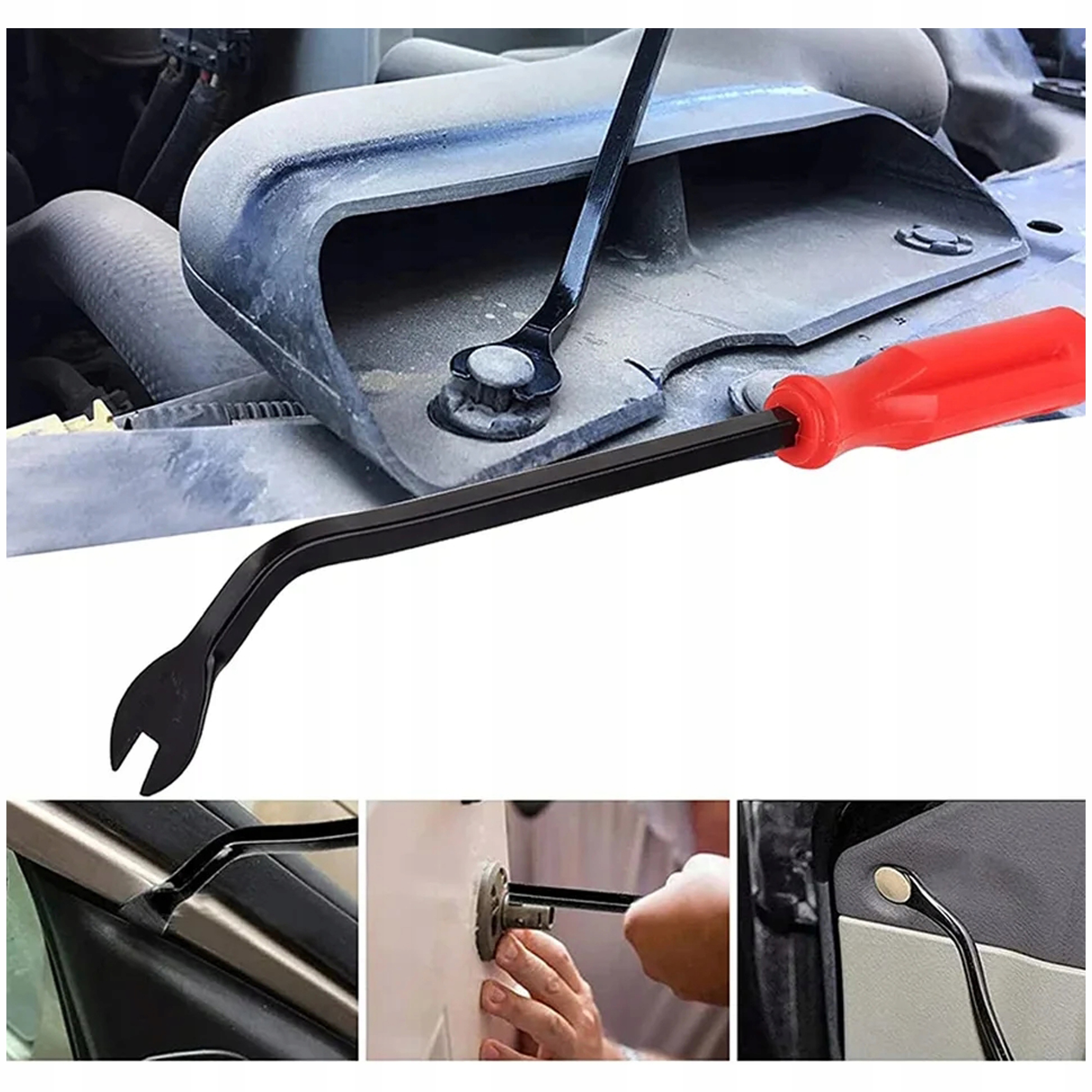 Богатый набор (до 12 элементов) обеспечивает высокую универсальность. Набор рекомендован для обивочных, кузовных и лакокрасочных работ. Обивочные съемники, захваты, съемники, ключи, благодаря которым вы сможете легко демонтировать пластиковые элементы техники, не повреждая их. Соответствие размеров и форм позволяет легко и быстро разбирать элементы. Инструменты не вызывают царапин и повреждений. Изготовлен из прочного материала. В комплект входит лом, который позволяет быстро и точно снять зажимы обивки в труднодоступных местах. Это значительно ускоряет процесс снятия элементов обивки.