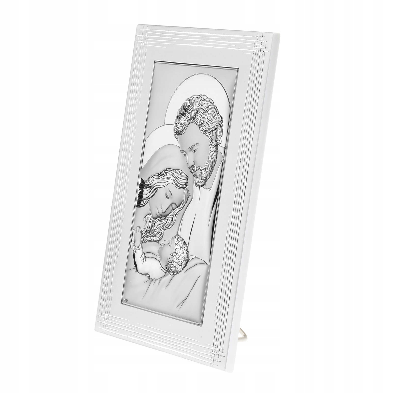 Серебряная картина итальянской постановки, изображающая святое семейство . Изображение было размещено на белой декоративной деревянной панели. Это будет идеальный подарок или сувенир по случаю свадьбы или годовщины свадьбы.