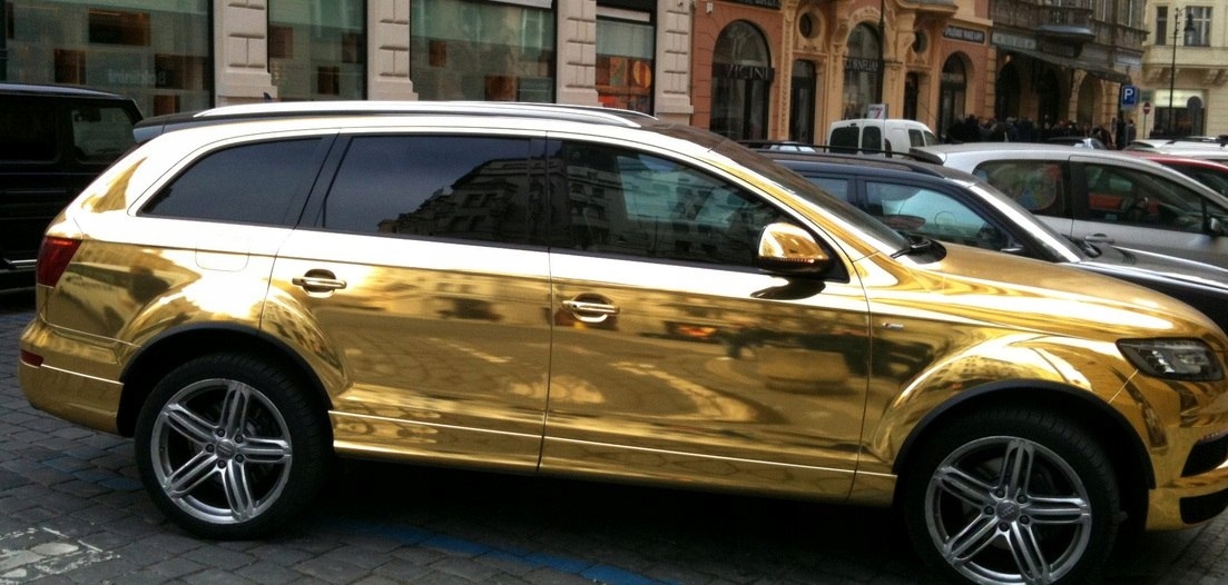 Высококачественная золотисто-хромовая автомобильная фольга. Подходит для упаковки автомобилей, а также салонов автомобилей, приборных панелей и т. д. Имеет уникальную систему микроканалов, которые облегчают выталкивание пузырьков воздуха во время нанесения, что делает установку намного проще, чем обматывать обычной пленкой. Хромированная пленка немного толще всех остальных автомобильных пленок, что приводит к меньшей гибкости пленки, поэтому для оклейки всего автомобиля ее рекомендуется использовать людям с опытом и в тех случаях, когда элементы не имеют сильно профилированных и сложных форм (особенно бамперы, зеркала и т. д.), для нагрева фольги используйте только тепловую пушку. В фольге используется прочный клей, поэтому она хорошо держится и не отслаивается. Пленка также устойчива к ультрафиолетовым лучам, атмосферным факторам, температуре, воде и дорожной соли.