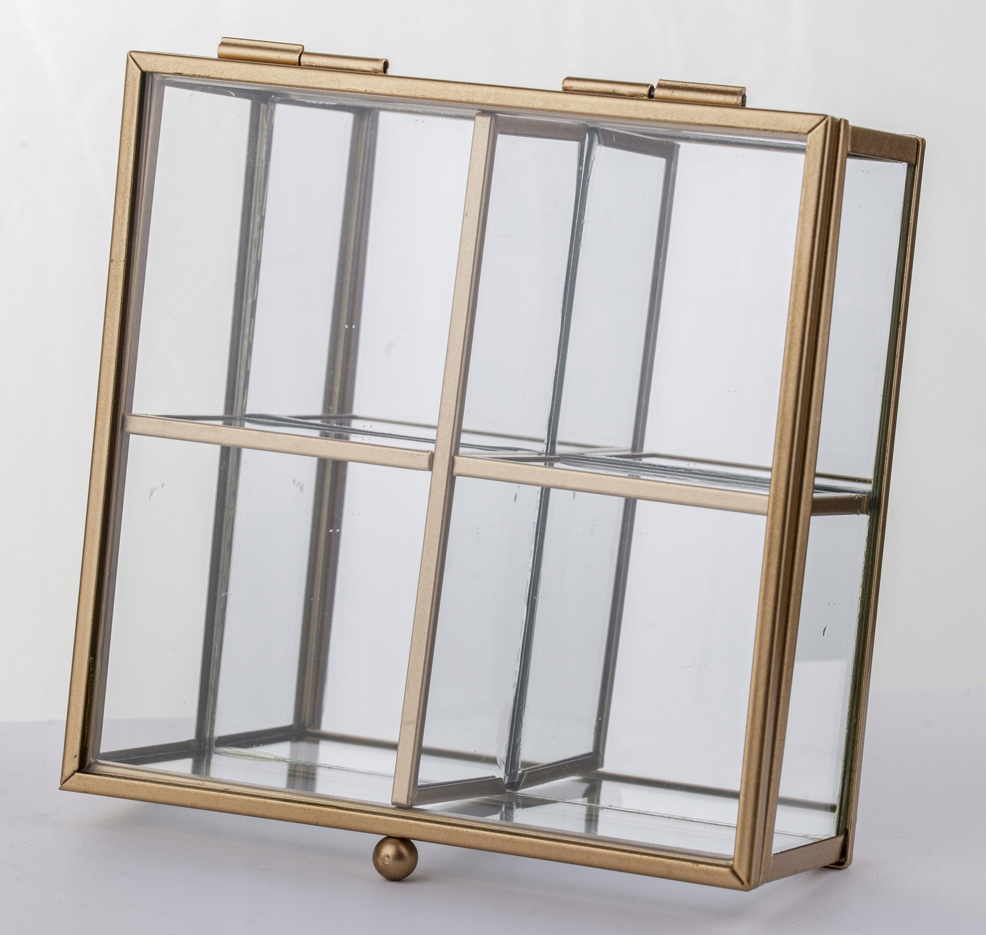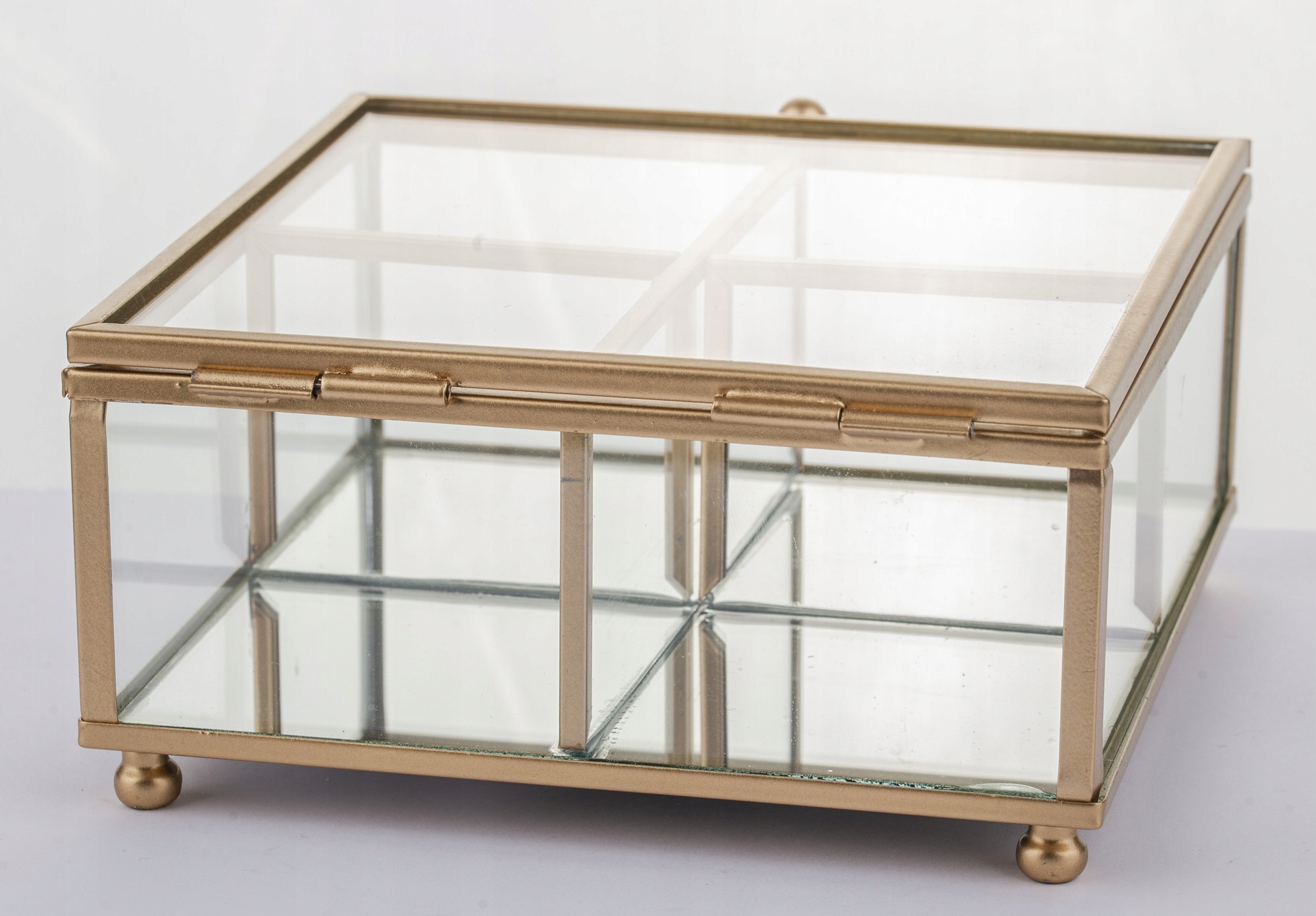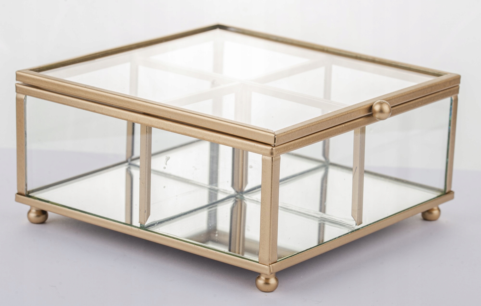 закрыт стеклянной крышкой, дно зеркальное, внутри стеклянные перегородки с эффектным золотым декором