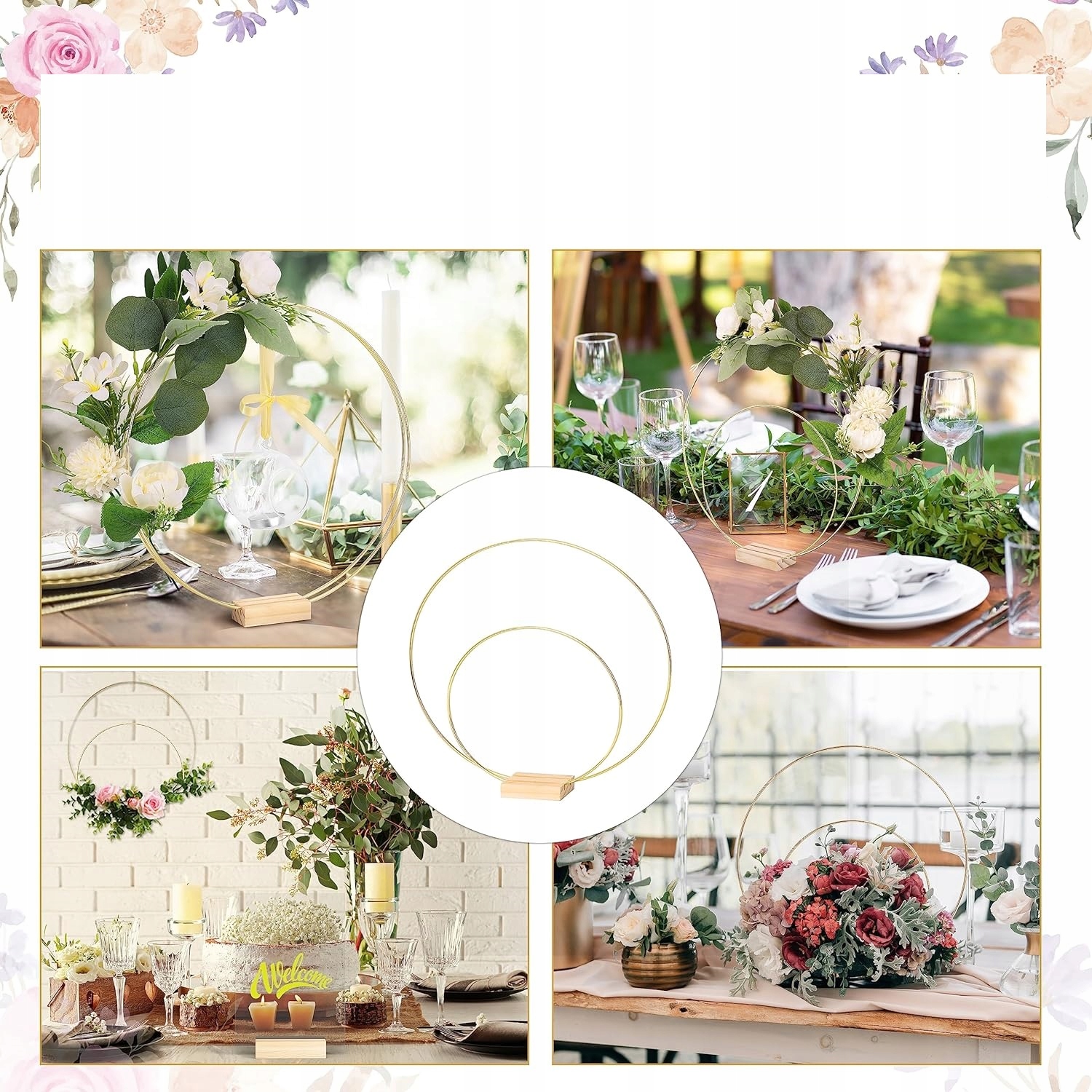 В комплект входят: 10 золотых металлических колец, 5 12-дюймовых золотых обручей с цветами и 5 8-дюймовых золотых цветочных обручей, а также 5 держателей из натурального дерева, на которых можно держать два ремесленных кольца одновременно. в то же время подходит для использования в качестве центрального украшения.