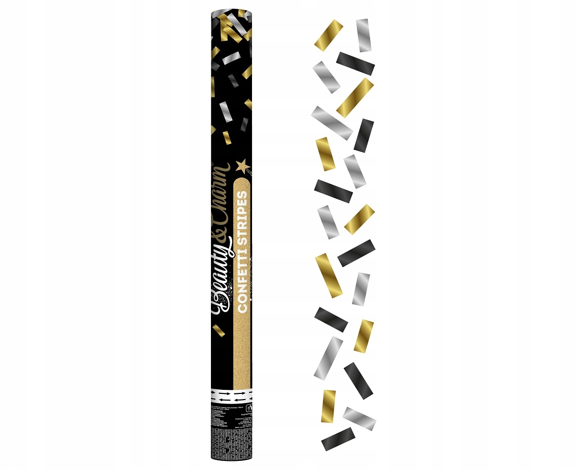 При ее повороте вылетает фольгированное конфетти в виде золотых, серебряных и черных полос, создавая видимый эффект.