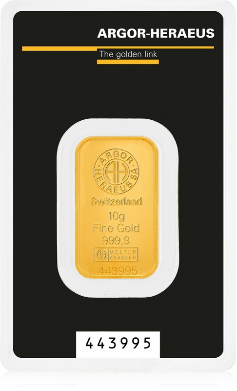 Золотой слиток от Argor-Heraeus весом 10 г, отчеканенный из золота 999,9 пробы. содержащая двухмерную голограмму KINEGRAM