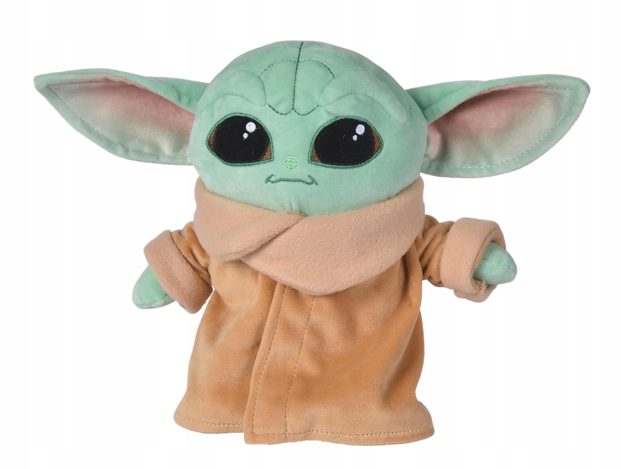 Талисман рассказывает о Высота 25 см. Он изготовлен из мягкого плюша фисташкового цвета. У него большие глаза и длинные уши. Малыш Йода одет в бисквитное пальто и шорты. Его глаза и улыбка вышиты. Игрушка изготовлена из мягкого плюша.