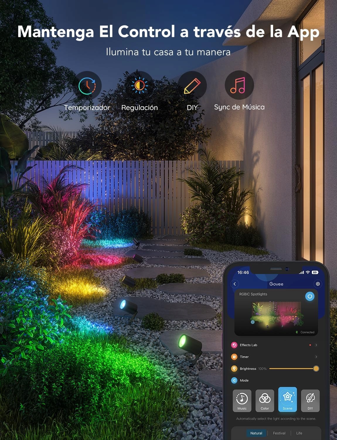Технология RGBIC позволяет использовать отдельные настройки цвета освещения. Выберите один из 35 режимов пейзажа, чтобы оживить деревья, осветить ландшафт уличными фонарями Govee и насладиться фантастической атмосферой украшения вашего открытого патио.