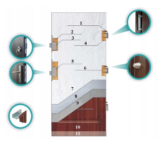 Толщина полотна и его структура позволили добиться удовлетворительного коэффициента звуко- и теплоизоляции. Технология изготовления позволяет обеспечить высокое качество и повторяемость изделия. Двери изготовлены из листового металла, устойчивы к «короблению» и легко выдерживают воздействие различных погодных условий. Доступен в следующих цветах: золотой дуб, орех, антрацит, предназначен для установки преимущественно в частных домах и на открытых пространствах.