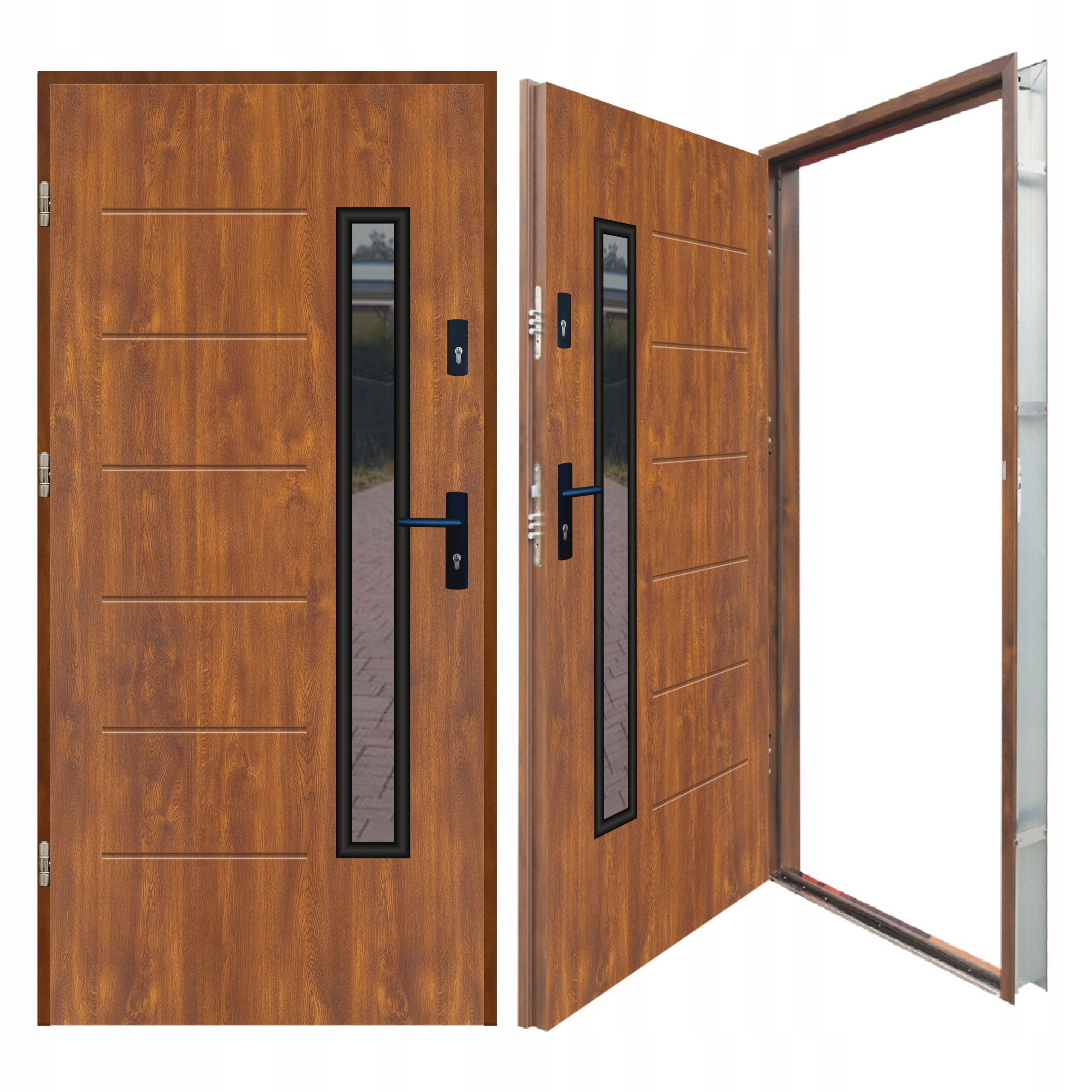 Двери оборудованы двумя 3-ригельными замками. За открывание отвечают три регулируемые петли, закрепленные противовзломными ригелями.Дополнительно можно изменить прилегание створки к раме с помощью регулируемой защелки замка.