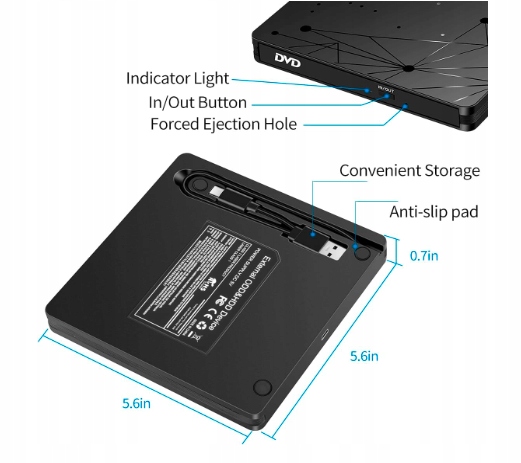 Этот внешний USB -диск DVD очень тонкий и легкий. Внешний размер диска составляет 14 * 14 * 1,6 см. Вы можете легко взять с собой небольшой диск Широкая совместимость