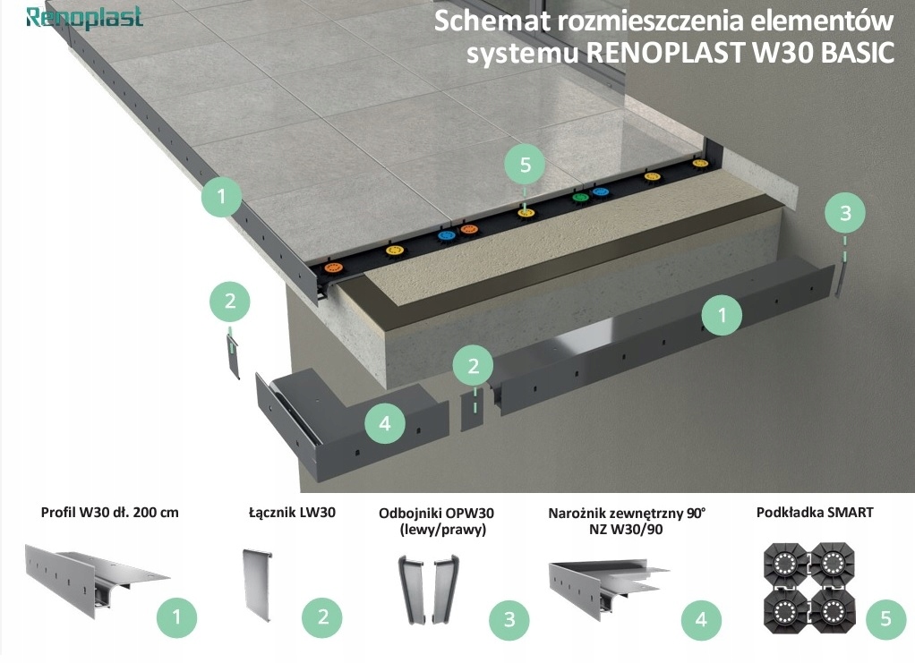 Уголок Renoplast W30 применяется в системах утепления вентилируемых террас и балконов, где используется плитка (камень, керамика, бетон) размещается на подушках террасы SMART.