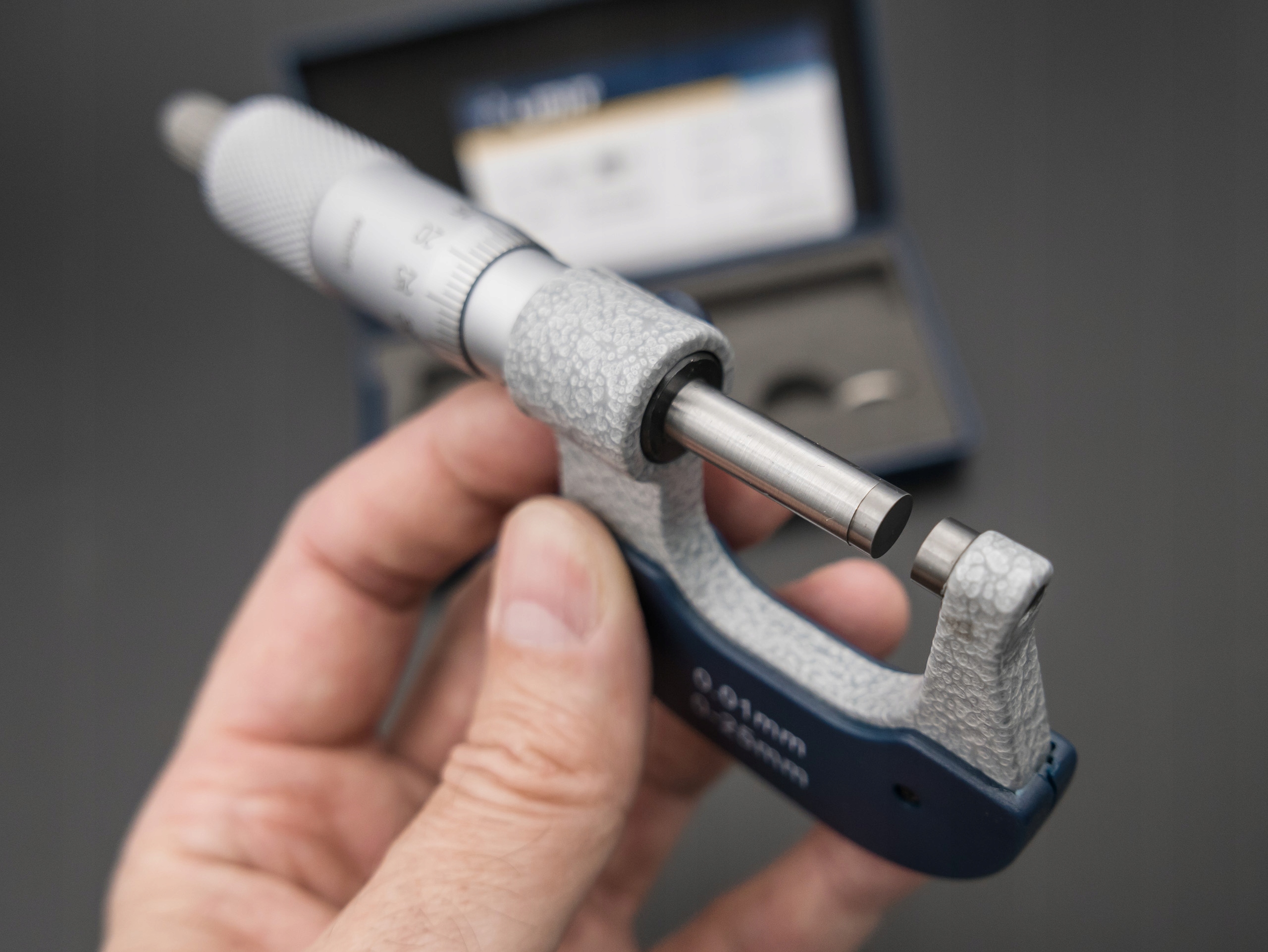 Кованая дужка и матовая хромированная шкала. Закаленный шпиндель диаметром 6,5 мм с точно притертыми измерительными поверхностями из спеченных карбидов. С муфтой сцепления и стопорным рычагом.