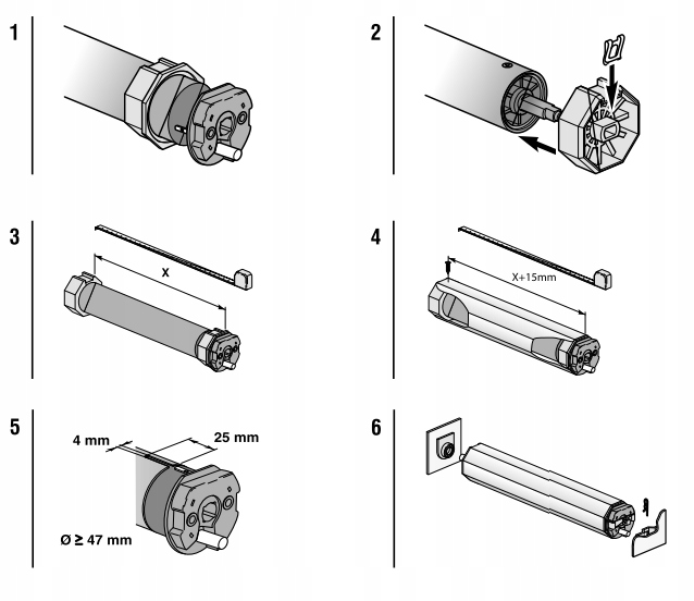 Двигатель не требует регуляции предельных позиций. Чтобы начать работу, установите двигатель и подключите его к источнику питания. Диск автоматически обнаруживает и сохраняет конечные точки в памяти. Он может быть установлен как на правой, так и на левой стороне слепых и управляется любым переключателем или кнопкой, оснащенной блокировкой перед включением обоих направлений.