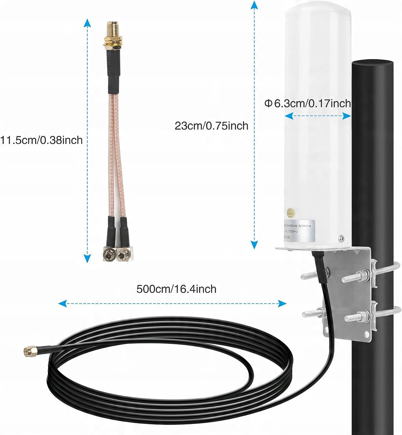 1️⃣Диапазон частот антенны 4G LTE 3G с высоким коэффициентом усиления: 698–960 МГц, 1710–2170 МГц, 2300–2700 МГц; Усиление: 10-12 дБи; всенаправленный; КСВ: <2,0; Импеданс: 50 Ом; Водонепроницаемый; Антенный разъем: SMA «папа»; Кабель: коаксиальный кабель RG58 длиной 5 метров;