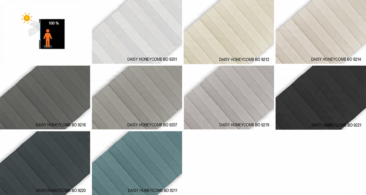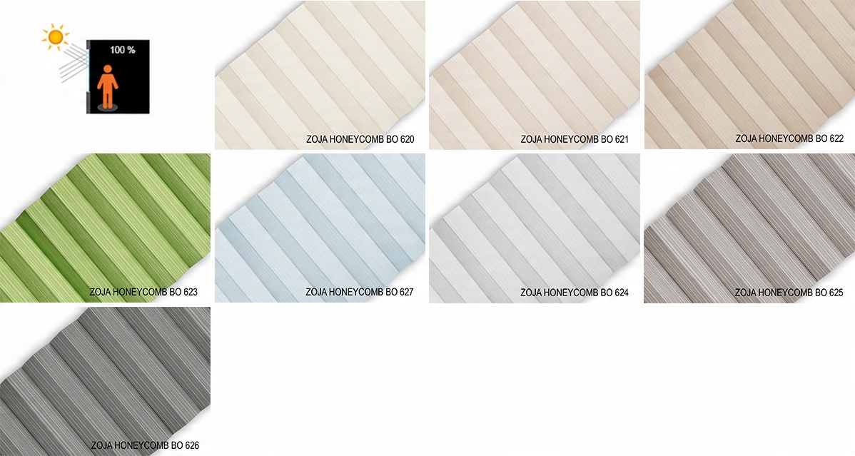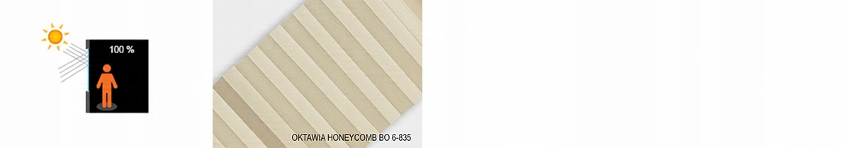 OCTAWIA, MALAYSIA, DAISY, ZOJA HONEYCOMB BLACKOUT - материал, комбинированный из двух складок. Для ткани «соты» характерны более мелкие складки в складках. В разрезе он напоминает соты. Благодаря специальной структуре с микроперфорацией и внутреннему алюминиевому покрытию использует воздушные камеры для дополнительной изоляции (звуковой и тепловой) и тем самым повышает энергетические параметры окна. Кроме того, соты повышают эстетику интерьера, позволяя разместить внутри ткани струнные механизмы и направляющие.