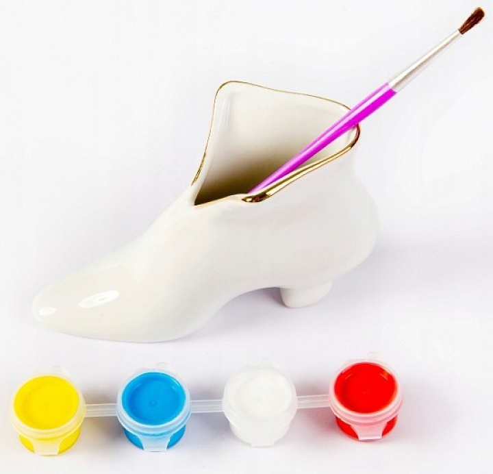 Набор для самостоятельного декорирования фарфоровой туфельки, которую можно использовать, например, как вазу. Раскрасьте его с помощью красок и кисточки, входящих в набор. Вы сами увидите, насколько это весело! Пусть ваши тапочки станут яркими и удивят окружающих. Фарфоровое чудо будет выглядеть красиво, в нем можно спрятать все, что захотите.