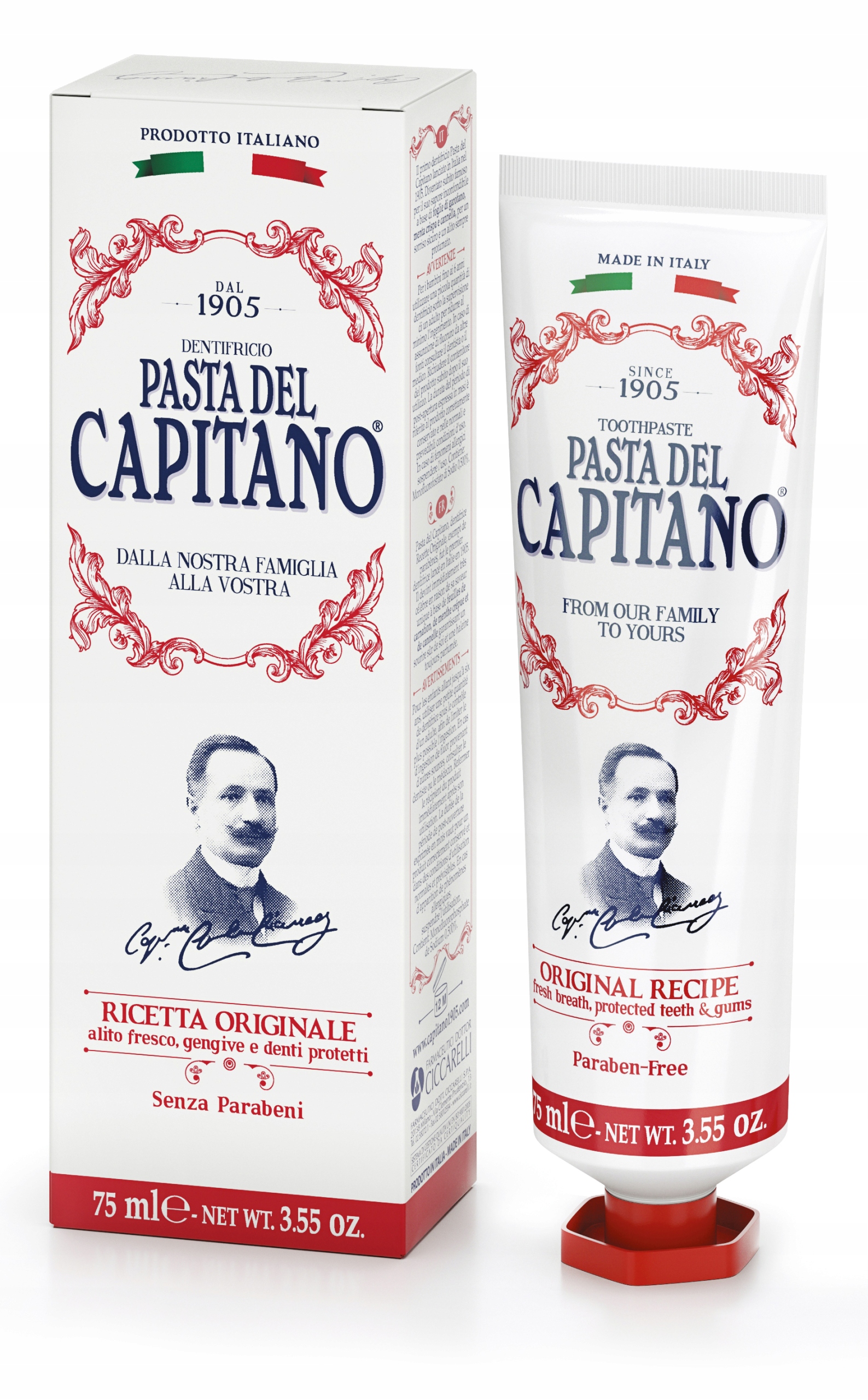 Это первая зубная паста в коллекции бренда Pasta del Capitano, премьера которой состоялась на итальянском рынке в 1905 году. Он прославился за очень короткое время благодаря своей уникальной формуле на основе сочетания листьев гвоздики, мяты и корицы, обеспечивающей свежее дыхание, уверенную улыбку, а также полную защиту зубов и десен. р>