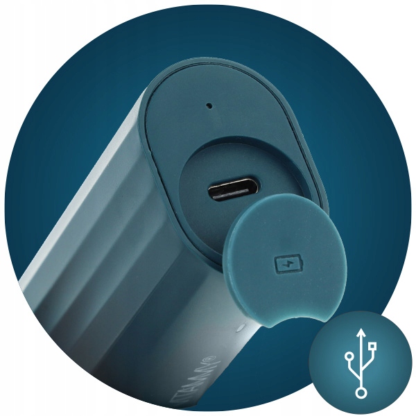Зубная щетка VITAMMY VIVO оснащена современной зарядкой USB-C, что обеспечивает удобство и универсальность. Его можно питать от зарядного устройства USB, блока питания или другого источника с портом USB. Гнездо USB-C, расположенное в основании держателя, защищено силиконовой заглушкой, защищающей от влаги и пролитой жидкости.