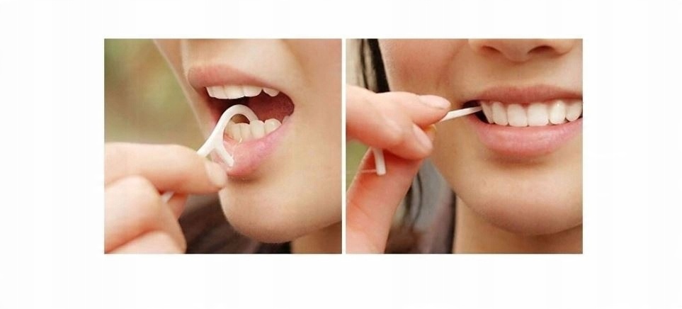 - Одной стороной зубочистки удаляем более крупные остатки пищи из промежутков между зубами.