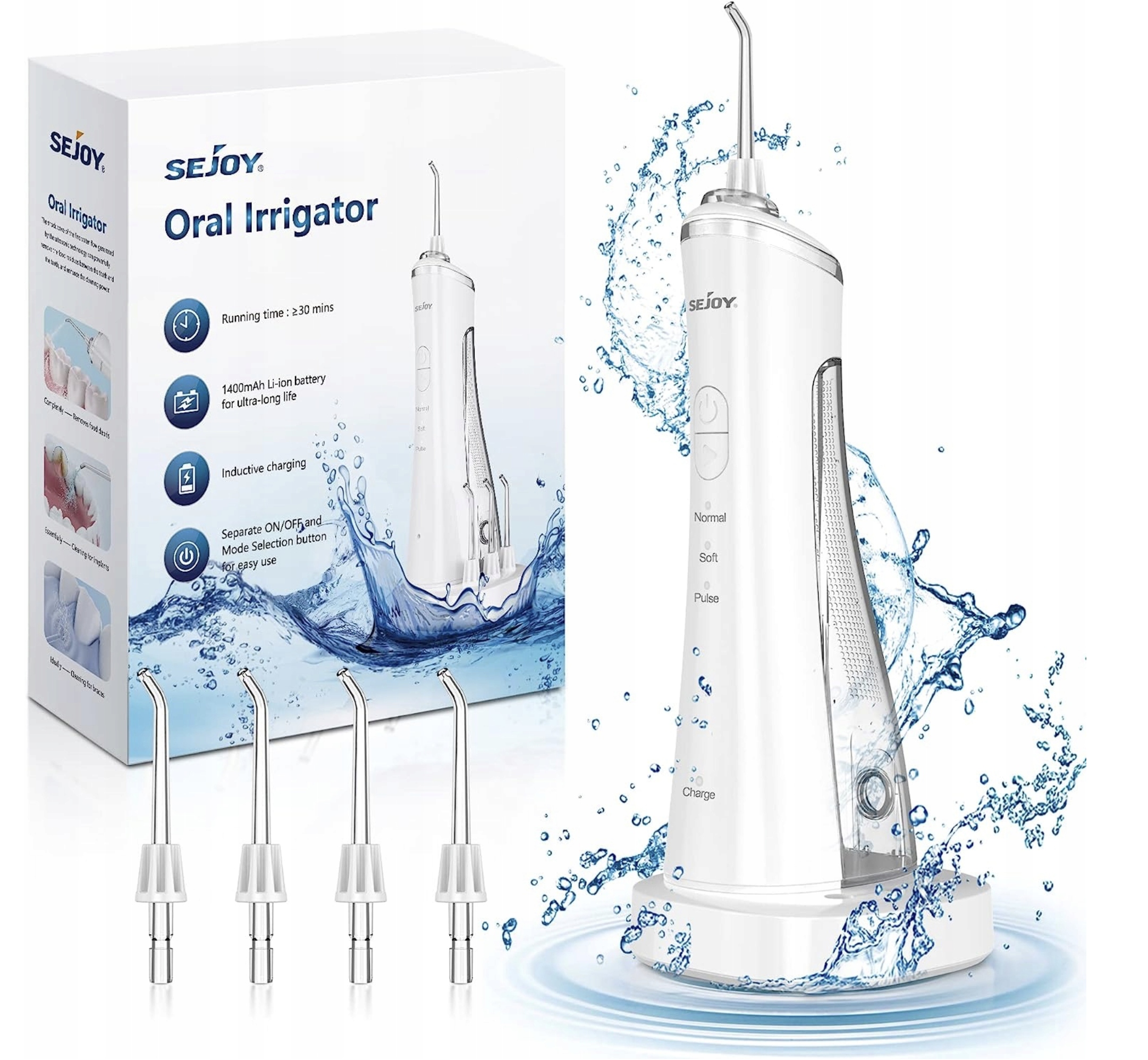 ЗУБНИЙ ІРИГАТОР SEJOY TB5011 БІЛИЙ IPX7 4 НАСАДКИ ІНДУКЦІЙНА ЗАРЯДКА