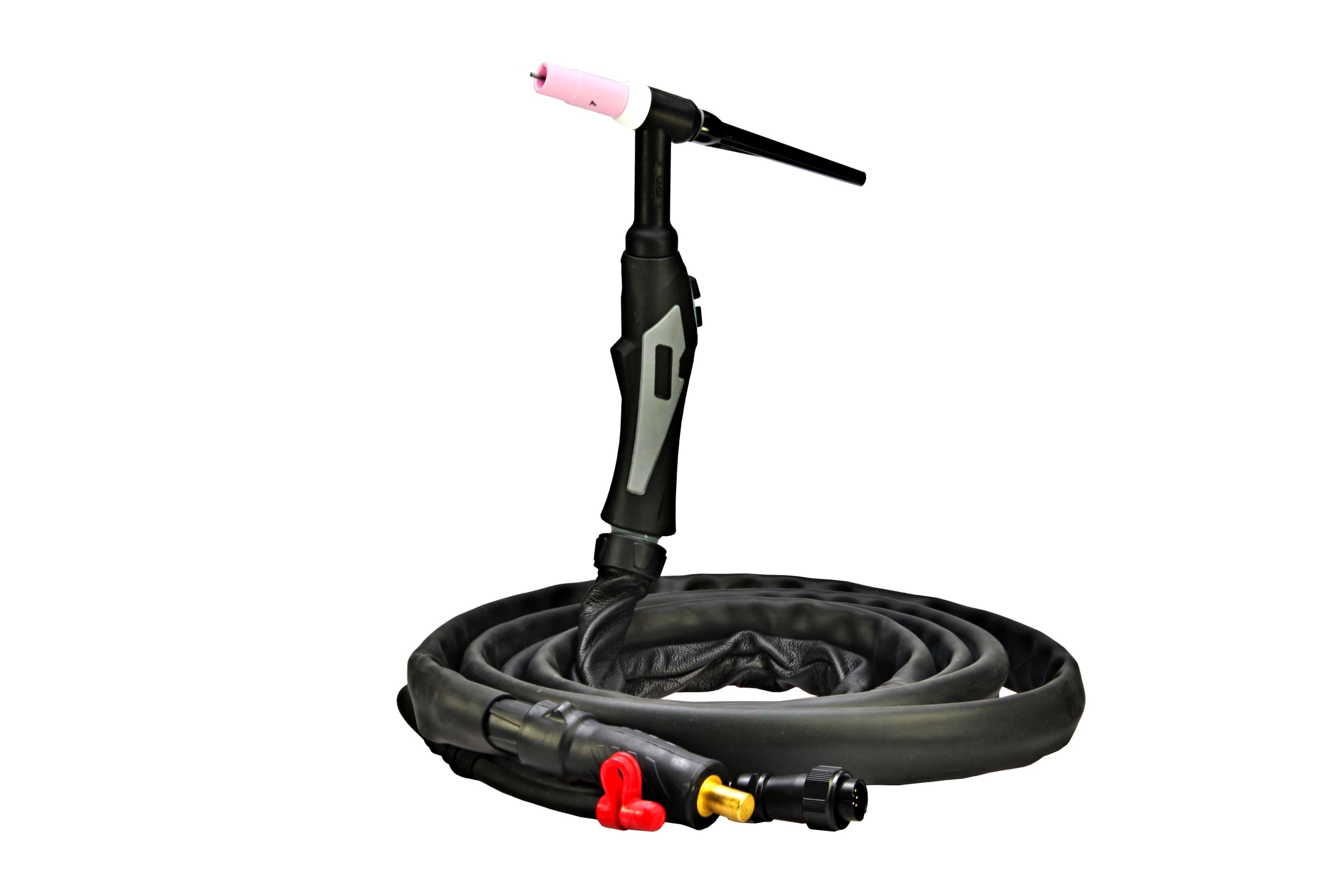Прибор оснащен высококачественной ручкой для сварки TIG SR 26, длина <б>4м . Он характеризуется высокой допустимой силой тока, благодаря чему легко справляется с длительными циклами и большими токами. Он также имеет дистанционное управление в рукоятке, что позволяет изменение сварочного тока в процессе работы без необходимости регулировки на панели аппарата.