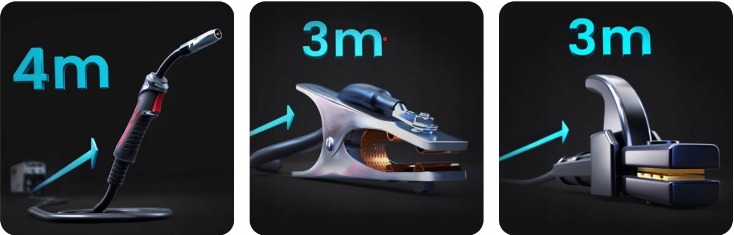 После установки силы тока на удобной цифровой панели он синергетически регулирует напряжение в зависимости от подачи проволоки, что упрощает использование. Отображает текущие настройки сварочного тока перед началом процесса сварки. Устройство оснащено 3-метровым цельномедным кабелем питания сечением 3x2,5 [мм2] и 3-метровым цельномедным кабелем сечением 25 [мм. >2] держатель массы. В комплект входят электродержатель 3-метровый и держатель MIG КД24 4-метровый.