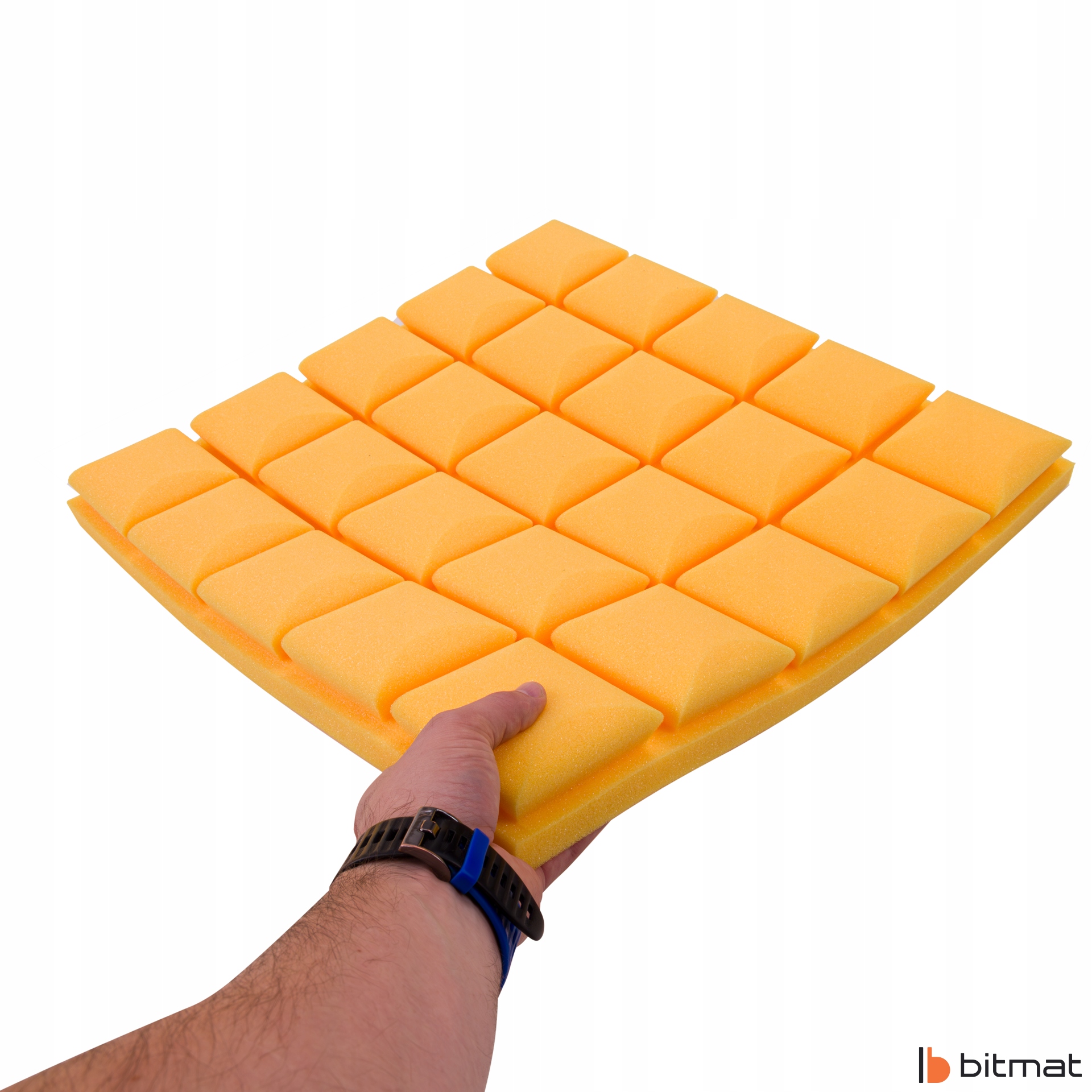 Акустическая выпуклая кубическая пена Bitmat, также называемая акустической панелью, изготовлена из вспененного полиуретана и имеет структуру с открытыми ячейками. Использование соответствующих конусов отлично работает в студиях, музыкальных комнатах/учебных кабинетах, поскольку улучшает разборчивость речи и вокала. Это оптимальное приложение, которое при относительно небольших затратах позволяет предотвратить реверберацию, улучшить качество звука в жилых и рабочих помещениях, создать современный дизайн.