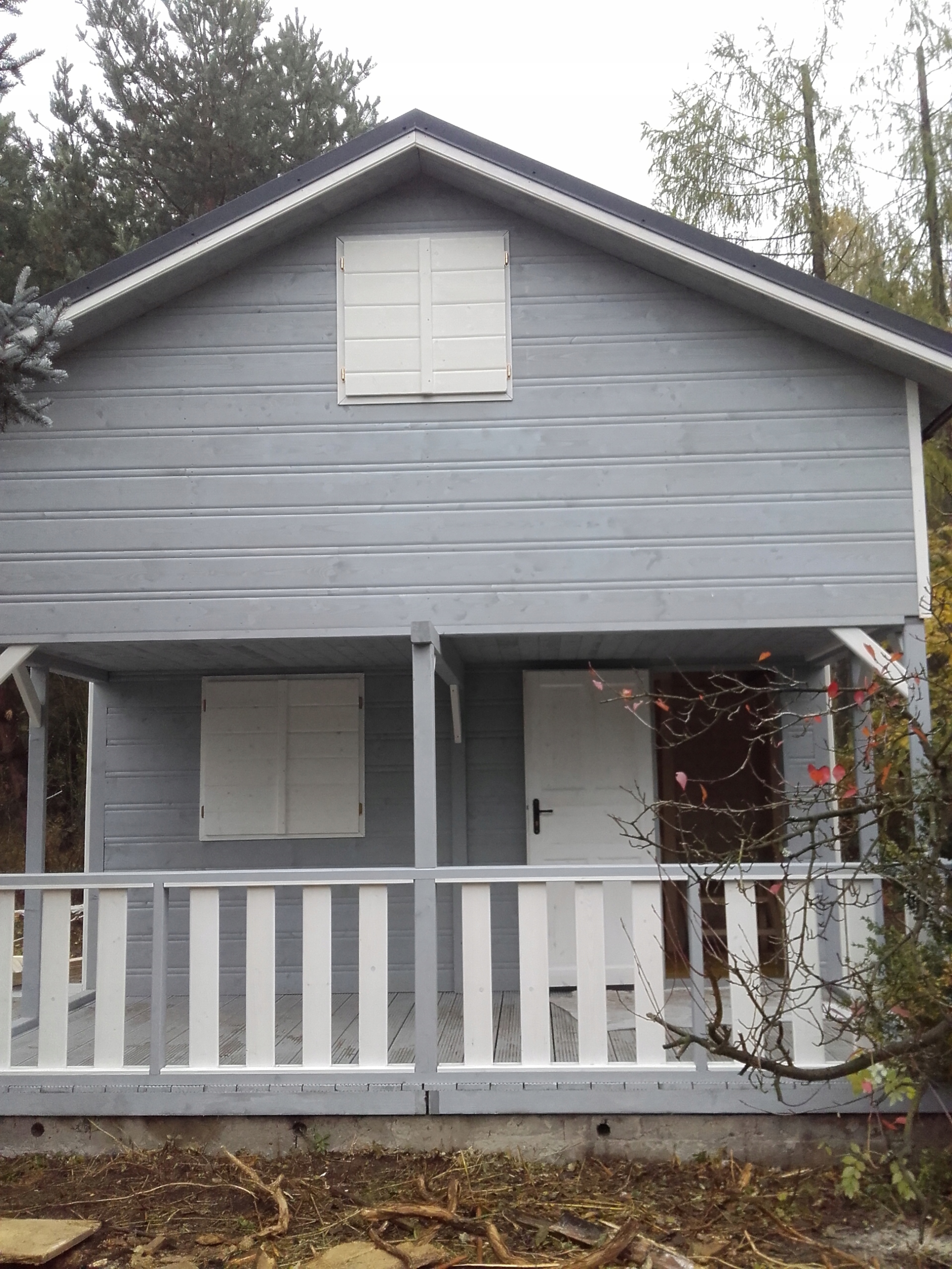 На горищі дві спальні, на першому поверсі вітальня та ванна кімната.Будинок зроблений з бруса 10 см на 5 см, обшитого дошками шириною 13 см. х 2,2 см товщиною блискавка Дах утеплений ватою 10 см, покритий бітумною черепицею або листом металочерепиці Підлога МФП 18 мм шерсть 10 см. На стелі балки 15 см х 6 см плюс дошка 2,2 см (паз). Будинок просочений АЛЬТАКСОМ, колір на фото БІЛИЙ з ТІКом (колір за узгодженням). )