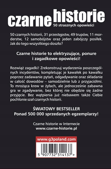 Чорні історії — це набір із 50 приголомшливих, жахливих, а часом моторошних історій, які насправді відбулися або... могли відбутися. По суті, це гра, в якій гравці намагаються вирішити запропоновані їм головоломки. В останні роки чорні історії набувають все більшої популярності в усьому світі. Тепер вони взялися завойовувати Польщу!