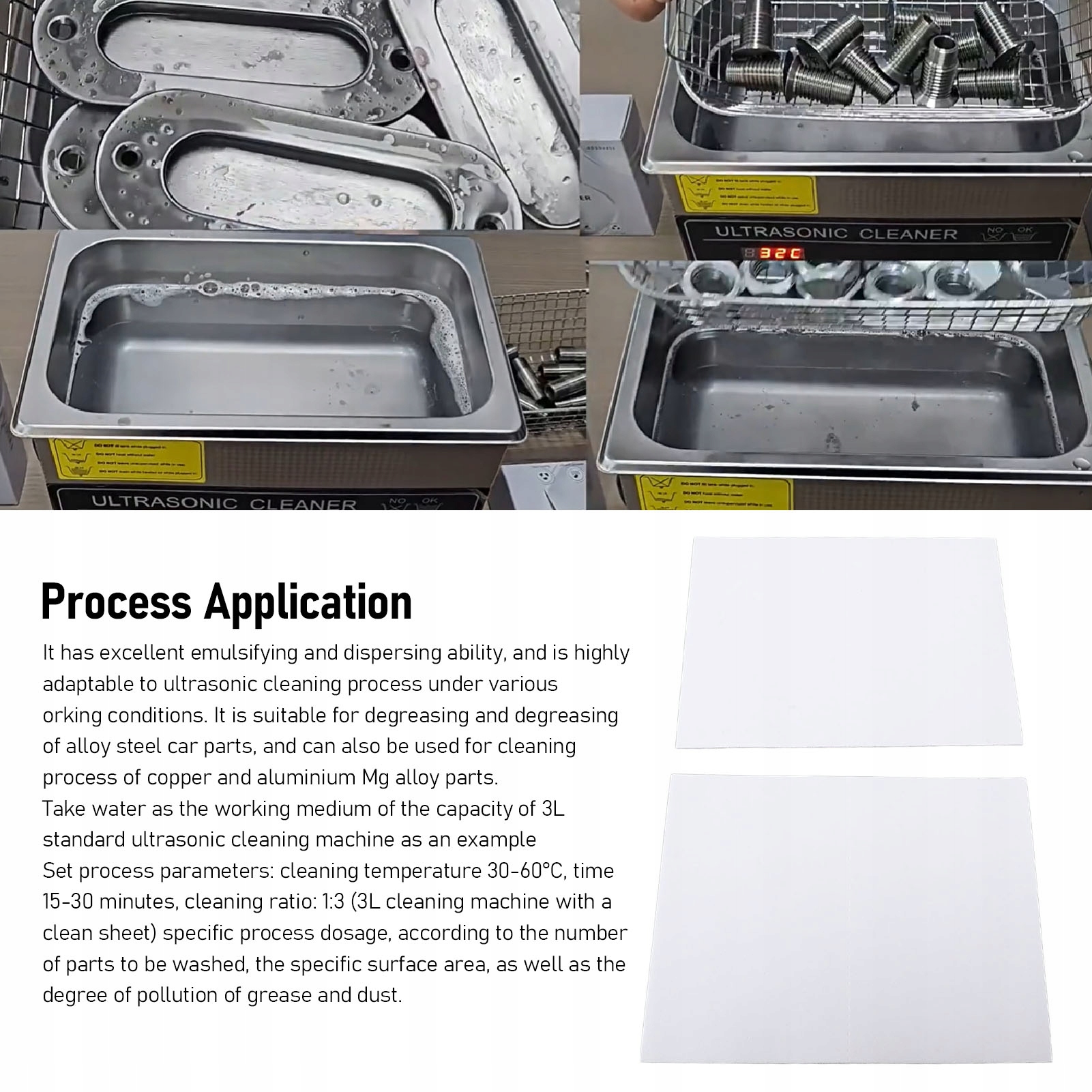 2. Багатофункціональність: Ультразвукове чистяще полотно виготовлено з унікальної суміші поверхнево-активних речовин, які біологічно розкладаються, а також високоефективних миючих засобів. Володіє диспергувальними і диспергуючими властивостями, запобігаючи осіданню масла на поверхнях очищених деталей і забезпечуючи захист від ерозії.