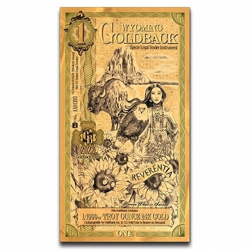 Кюпюра номіналом Вайомінг 1 Goldback відображає чесноту благоговіння, прирівняну до поваги. На цьому малюнку вона зображена як індіанська жінка-шошонка, одягнена в традиційний оленяний одяг і стоїть на тлі північно-східного регіону Вайомінг. Під нею напис «Шануй святе». Її волосся вільно розвівається на вітрі, даруючи загальне відчуття свободи. На задньому плані можна побачити утворення, яке називають Вежею Диявола або Мато Типіла (Ведмежа хата). Мато Тіпіла є священним місцем для багатьох корінних американців у регіоні.