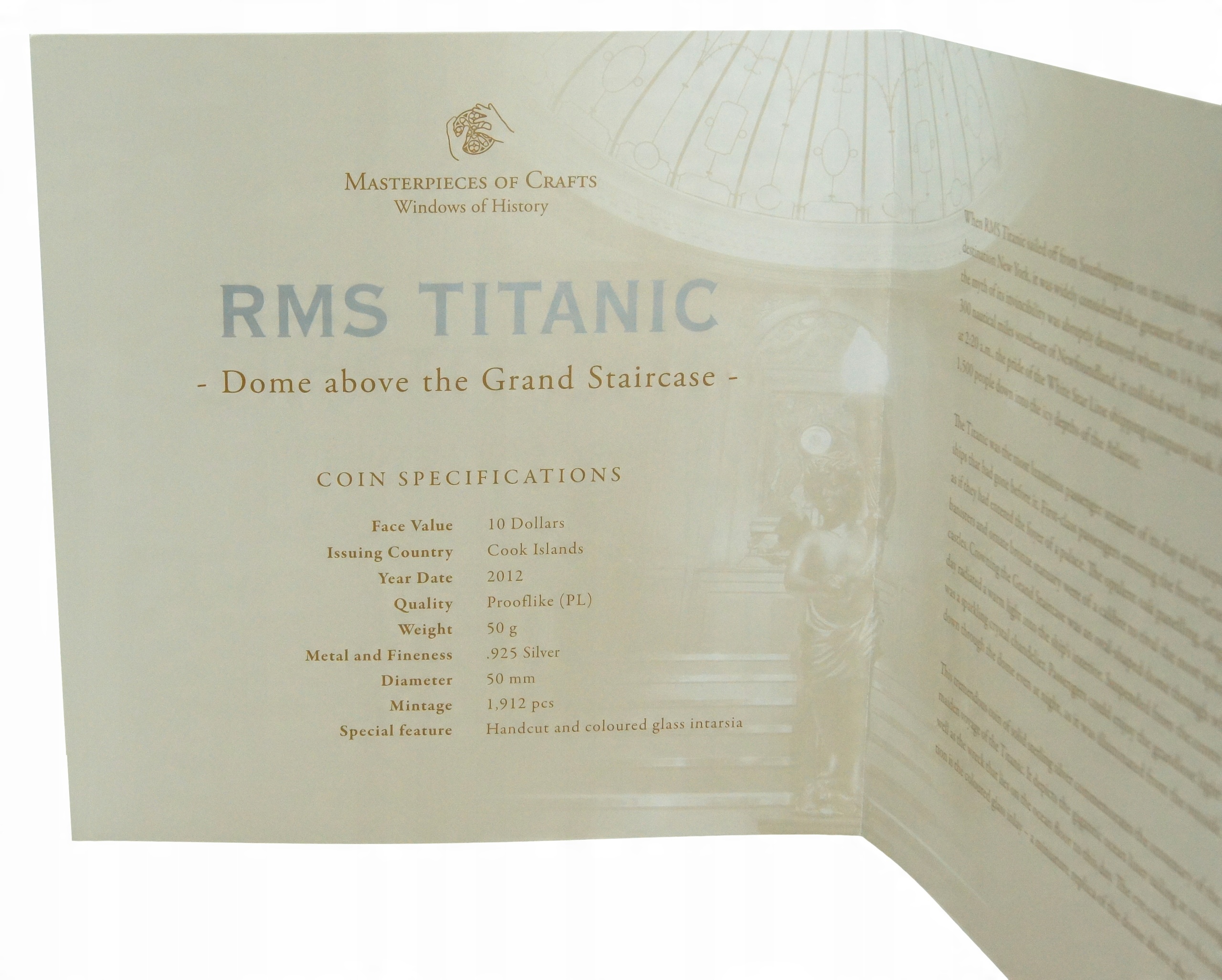 Монета знаходиться в оригінальній ексклюзивній упаковці у вигляді вікна разом із сертифікатом у формі буклету з описом монети та історії Титаніка та тематики сама монета, тобто купол над парадними сходами.