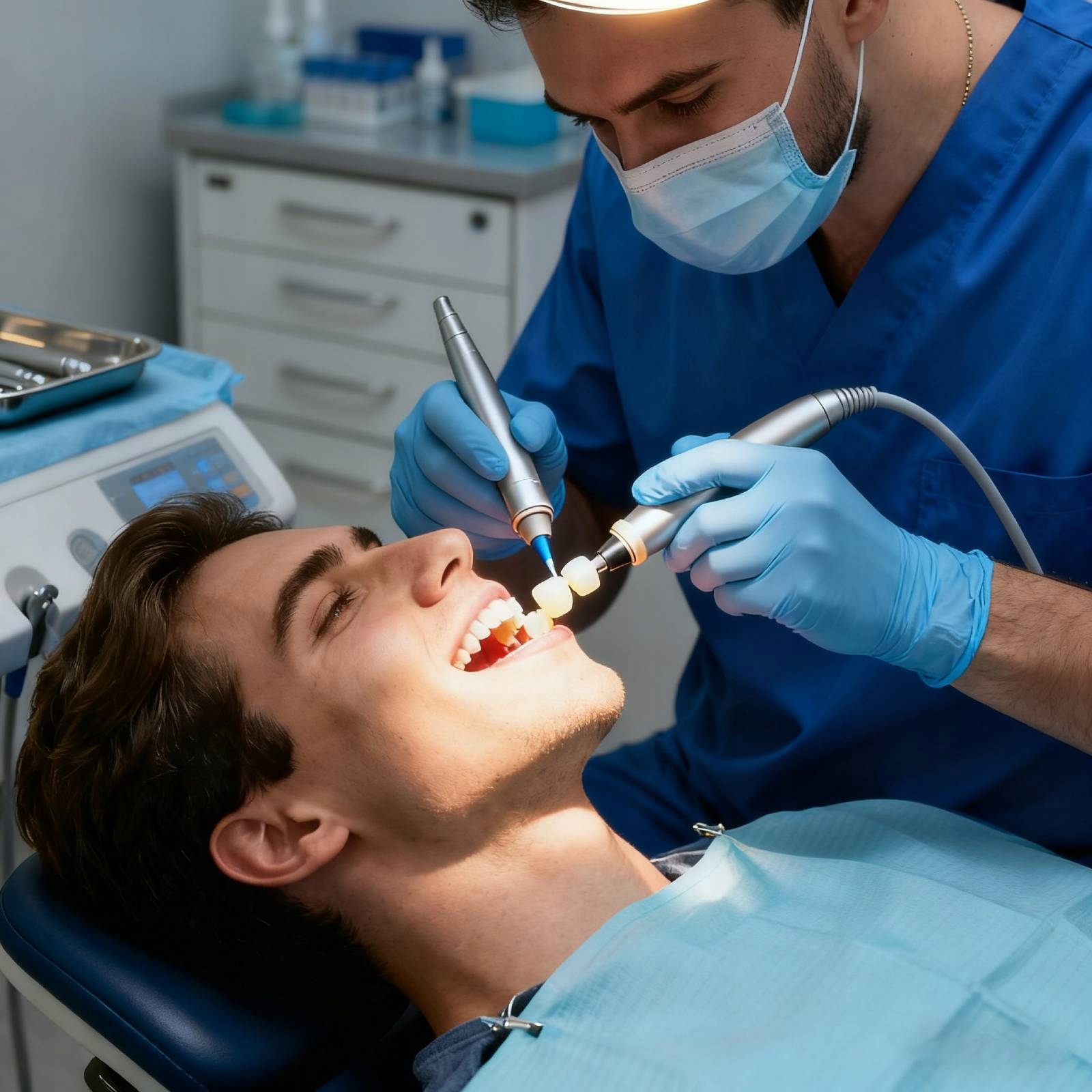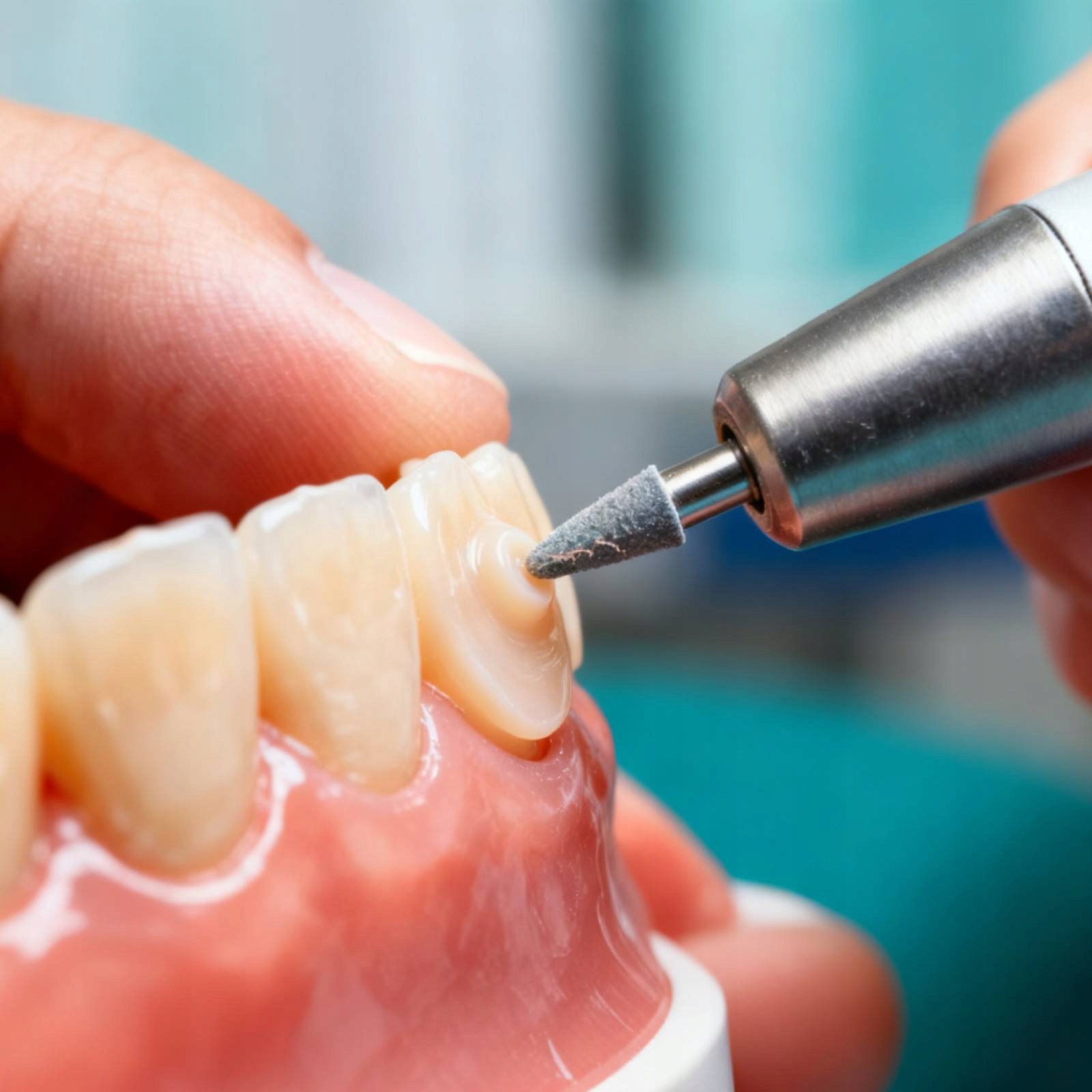 Стоматолог використовує низькошвидкісну ручну дриль, оснащену силіконовим наконечником, щоб ретельно полірувати поверхню щойно встановленої порцелянової коронки в роті пацієнта. Це дозволяє видалити дрібні подряпини, надавши поверхні зуба гладкість і блиск.