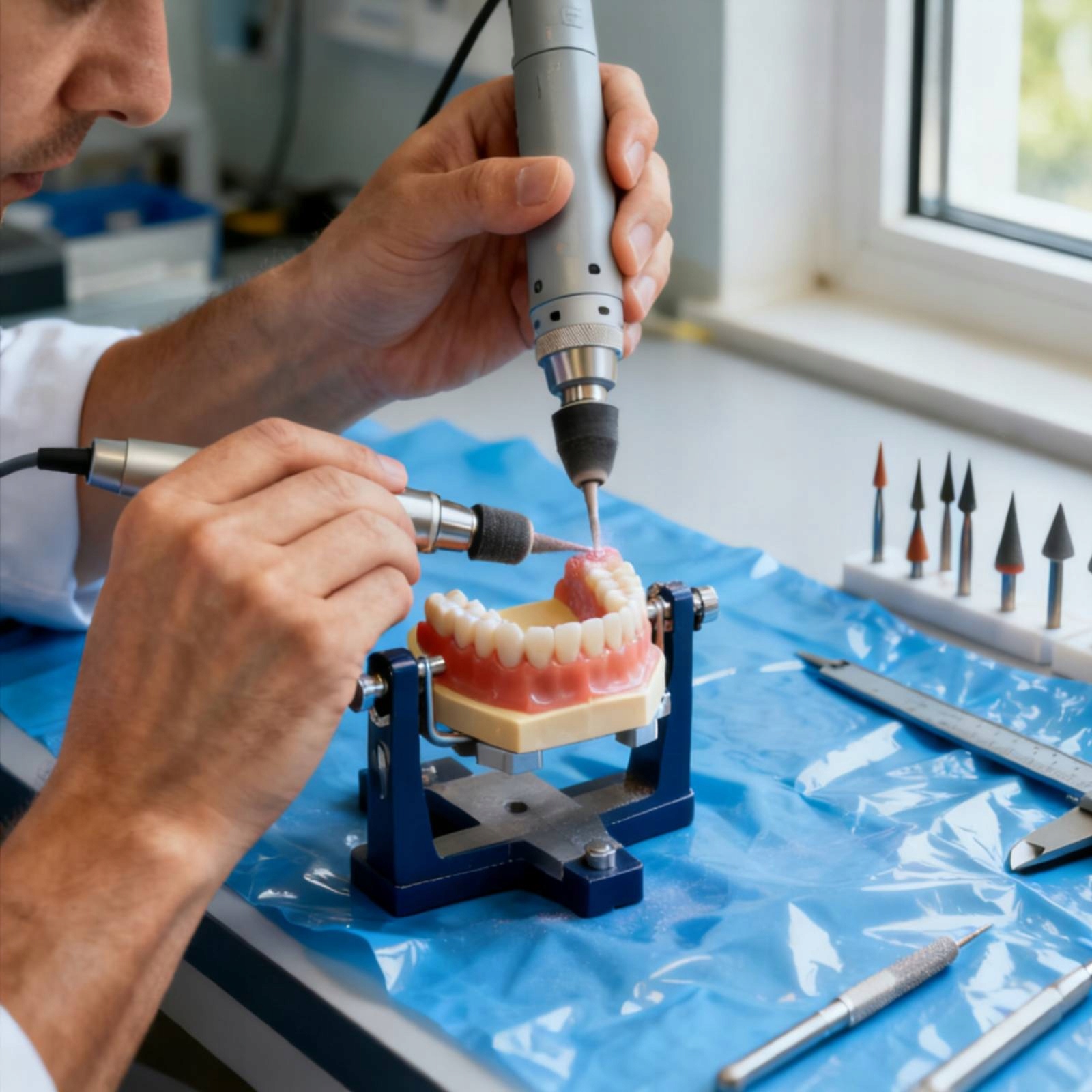 У лабораторії техніки полірують краї та контактні поверхні знімних або незнімних зубних протезів за допомогою силіконових полірувальних головок. Це забезпечує зручну посадку під час носіння, усуваючи гострі краї, які можуть дратувати слизову оболонку порожнини рота.