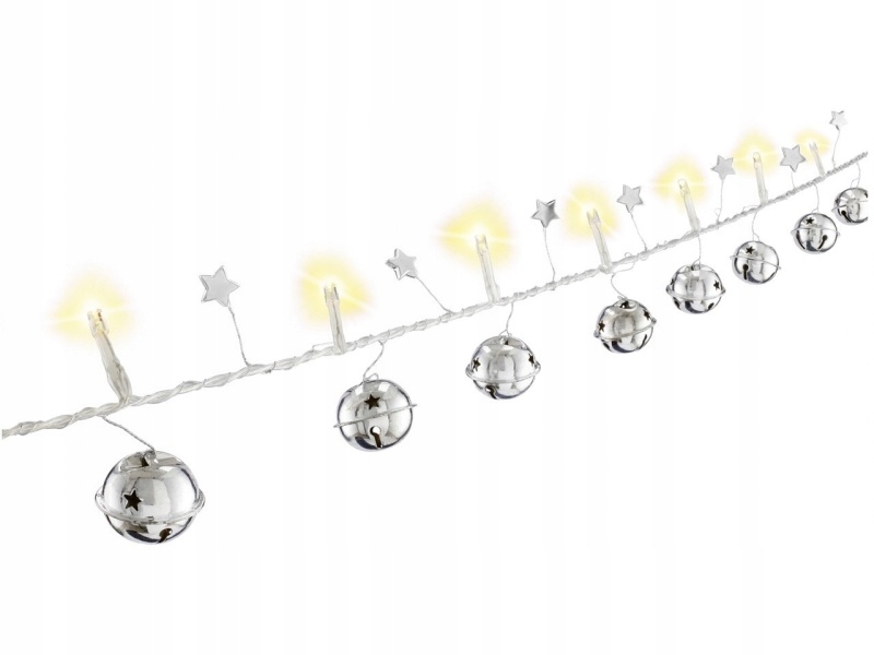 - Різдвяний світловий ланцюжок, що складається з 10 світлодіодних ламп теплого білого кольору зі срібними дзвіночками та зірочками як декоративні прикраси.