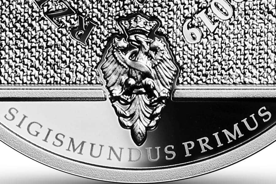 Аверс: по центру , на фоні окремої площини, що демонструє фрагмент полотна в рамці, зображення орла, встановленого як герб Республіки Польща, під орлом, праворуч знак монетного двору: м/ш, навколо орла напис: RZECZPOSPOLITA POLSKA 2019, внизу, частково на тлі полотна, зображення орла з фасаду каплиці собору Сигізмунда на Вавелі. Під поверхнею напис півколом: SIGISMUNDUS PRIMUS. Вгорі, над поверхнею, напис: 10 ZŁ.