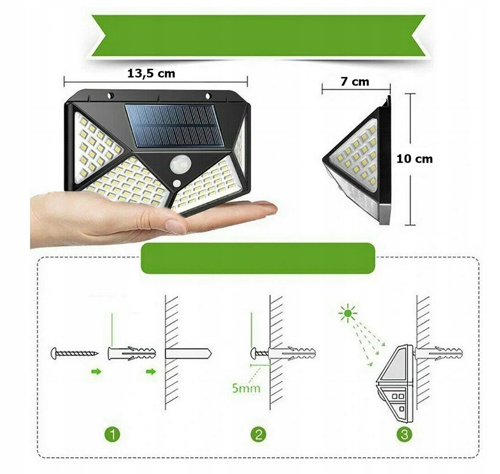 Сонячна лампа, що заряджається від сонячної панелі, забезпечує безкоштовне освітлення цілий рік. Завдяки простому та швидкому монтажу ми можемо використовувати його в місцях із слабким освітленням, не проводячи електромонтажу, наприклад, на фасаді будинку, гаражі чи господарських будівлях, або під’їзді до власності. Без проблем працює взимку та в похмурі дні, коли сонця мало.
