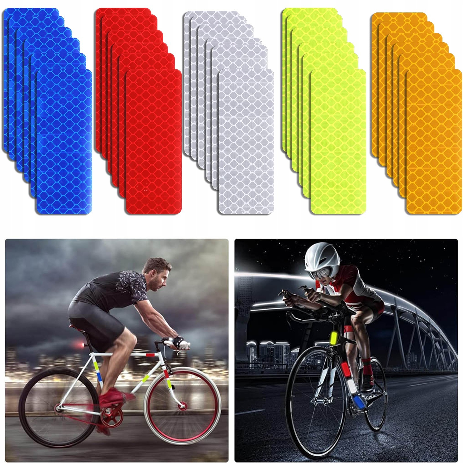 КОМПЛЕКТ ПОСТАВКИ - Світловідбиваючі наклейки доступні в 5 кольорах: помаранчевий, жовто-зелений, червоний, білий і синій, по 20 штук кожного кольору, що становить 100 штук. Розмір: 3 х 8 см. ЗАСТОСУВАННЯ - Самоклеюча світловідбиваюча стрічка добре помітна як вдень, так і вночі та ідеально підходить для використання на велосипедах, автомобілях, шоломах, рюкзаках, причепах, одязі тощо.