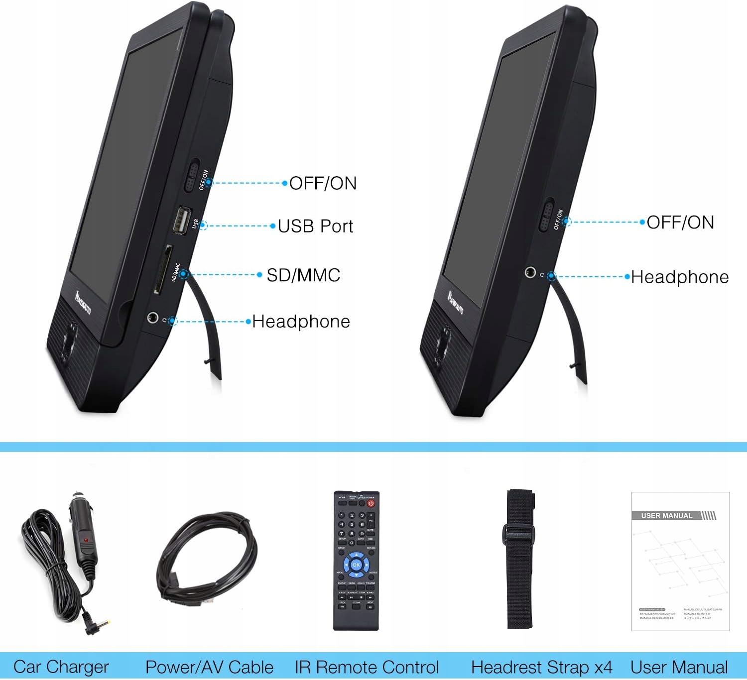 - Вбудована акумуляторна батарея: Завдяки вбудованій акумуляторній батареї портативний DVD-програвач із подвійним екраном продовжить відтворення, позбавляючи ваших дітей від плачу та крику через раптове переривання; Автомобільний зарядний пристрій в комплекті, можна дивитися фільми під час зарядки