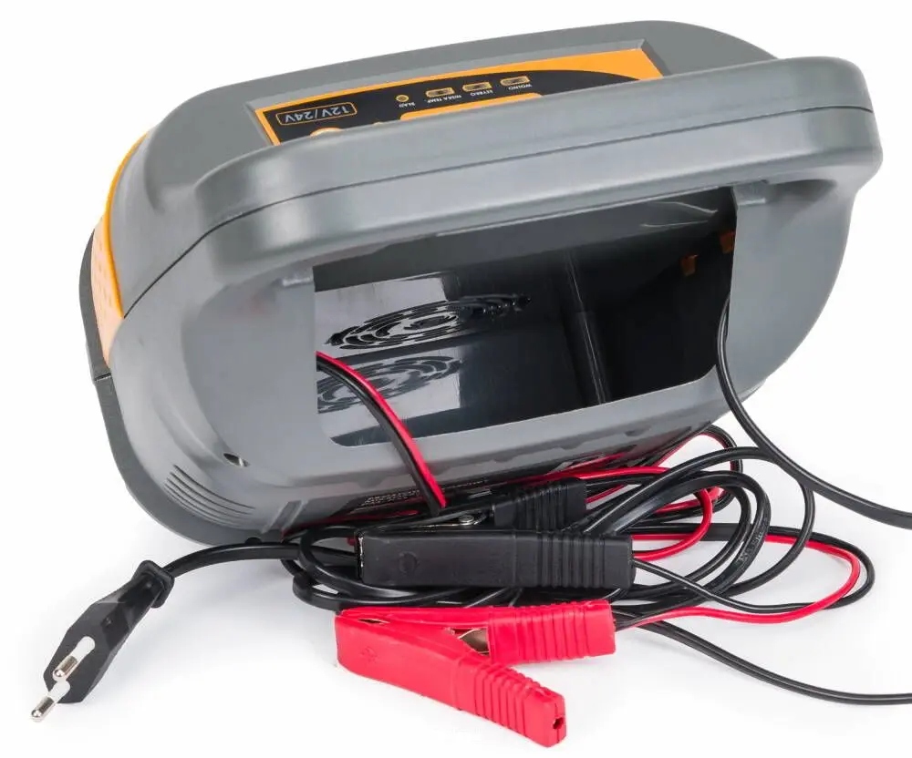 Пристрій має зручне зберігання кабелів живлення та кабелі з "+" і "-" затискачами.