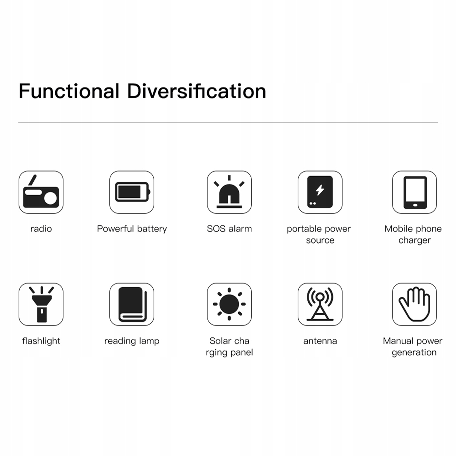 【Надійний і міцний】: виготовлений із високоякісних матеріалів, цей радіоприймач є міцним. Міцна конструкція та рейтинг водонепроникності IPX3 роблять його стійким до різних погодних умов. Незалежно від того, чи загрожує вам відключення електроенергії чи стихійне лихо, ця надійна екстрена радіостанція інформуватиме вас і матиме зв’язок із зовнішнім світом.