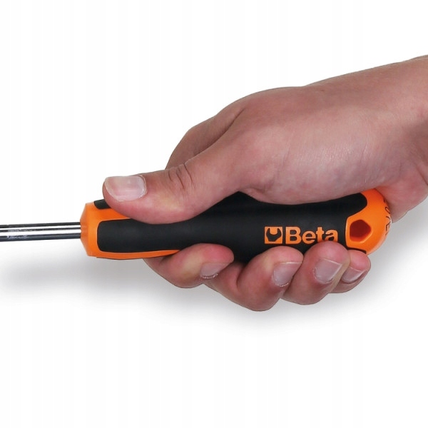 Еволюція викрутки!• Двоматеріальна рукоятка забезпечує зручність використання та дозволяє передавати максимальну силу з мінімальними зусиллями.• Ергономічна форма ідеально лежить у руці.• Маркування профілю та розміру наконечника розміщено на сферичній голівці для швидкої ідентифікації.• Перевірені наконечники Beta забезпечують виняткову гнучкість, твердість і зносостійкість інструментів високого класу.• Наконечник без хромованого покриття забезпечує кращу посадку на гвинт, фосфатований для захисту від окислення.• Новим є отвір у ручці, який дозволяє повісити викрутку