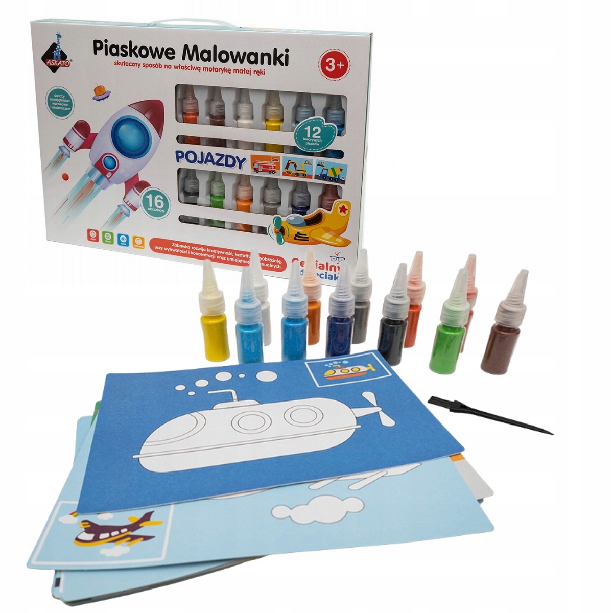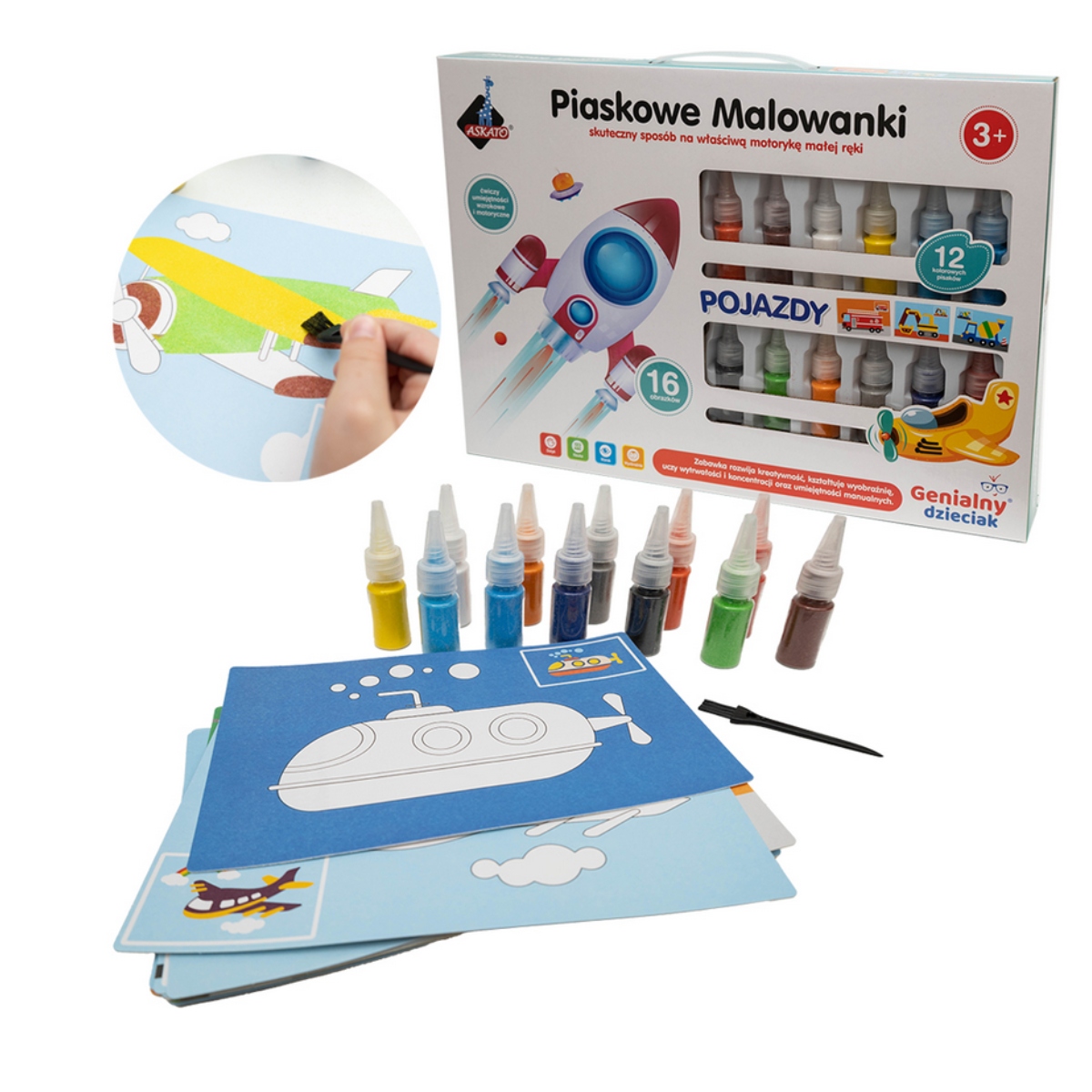 · 12 кольорів піску в зручних контейнерах/дозатори