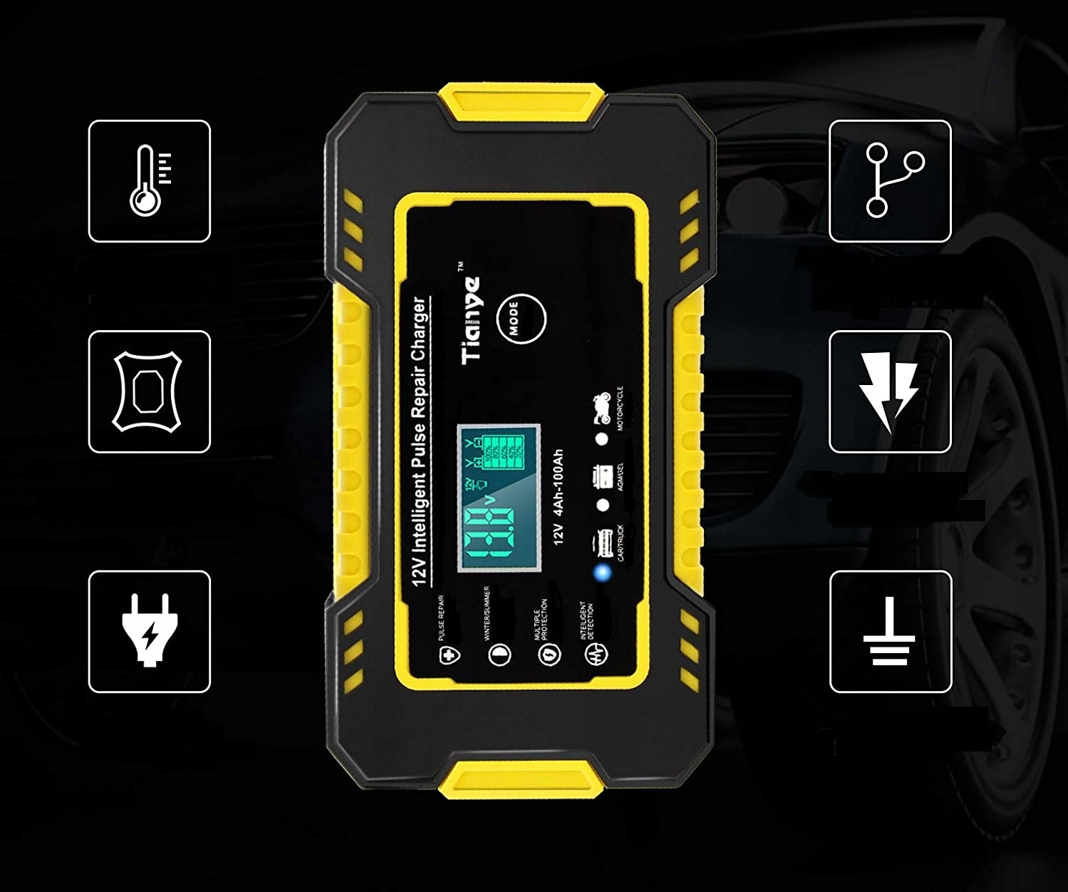 Зарядний пристрій забезпечує захист від зворотної полярності, короткого замикання, перенапруги, низької напруги, перевищення струму та перегрівання, зворотного зв’язку, ураження електричним струмом (повністю обгорнуті кліпси типу «крокодил» міцні та безпечні для використання).