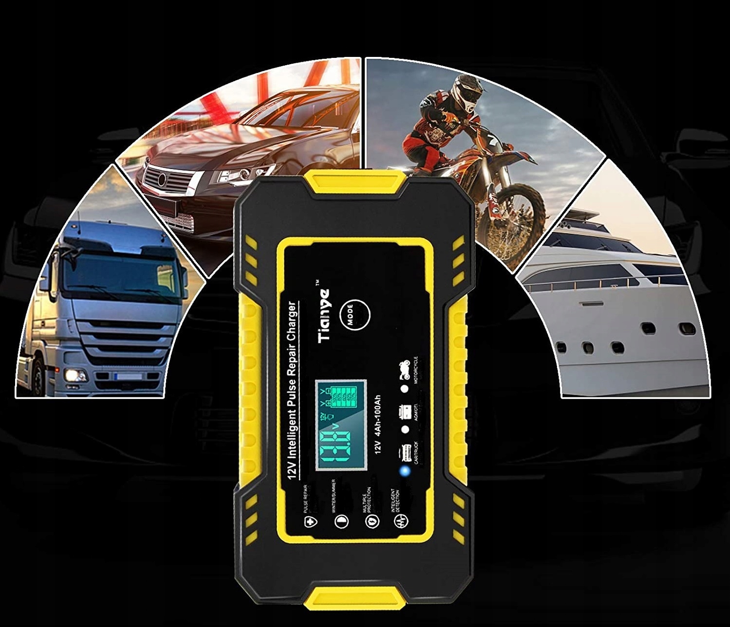 Керування акумулятором однією кнопкою. Використовуйте його для вибору відповідного режиму роботи (автомобіль, мотоцикл, акумулятор Start-Stop).