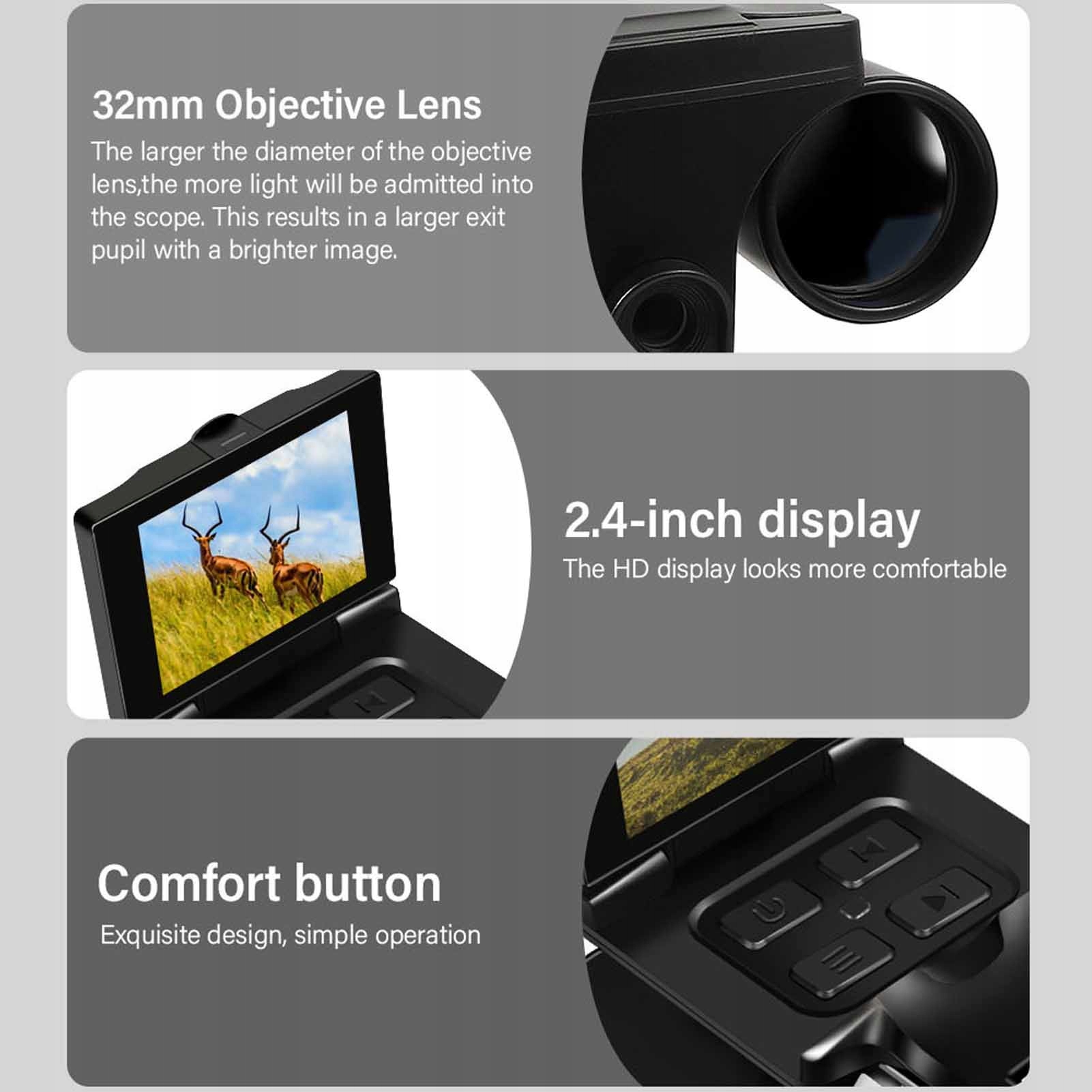 2. Покращене оптичне масштабування: оснащений 32-мм об’єктивом і 12-кратним оптичним масштабуванням бінокль забезпечує кришталево чітке зображення. Відчуйте ширше поле зору, ідеальне для дистанційних спостережень, як-от спостереження за дикою природою та птахами.