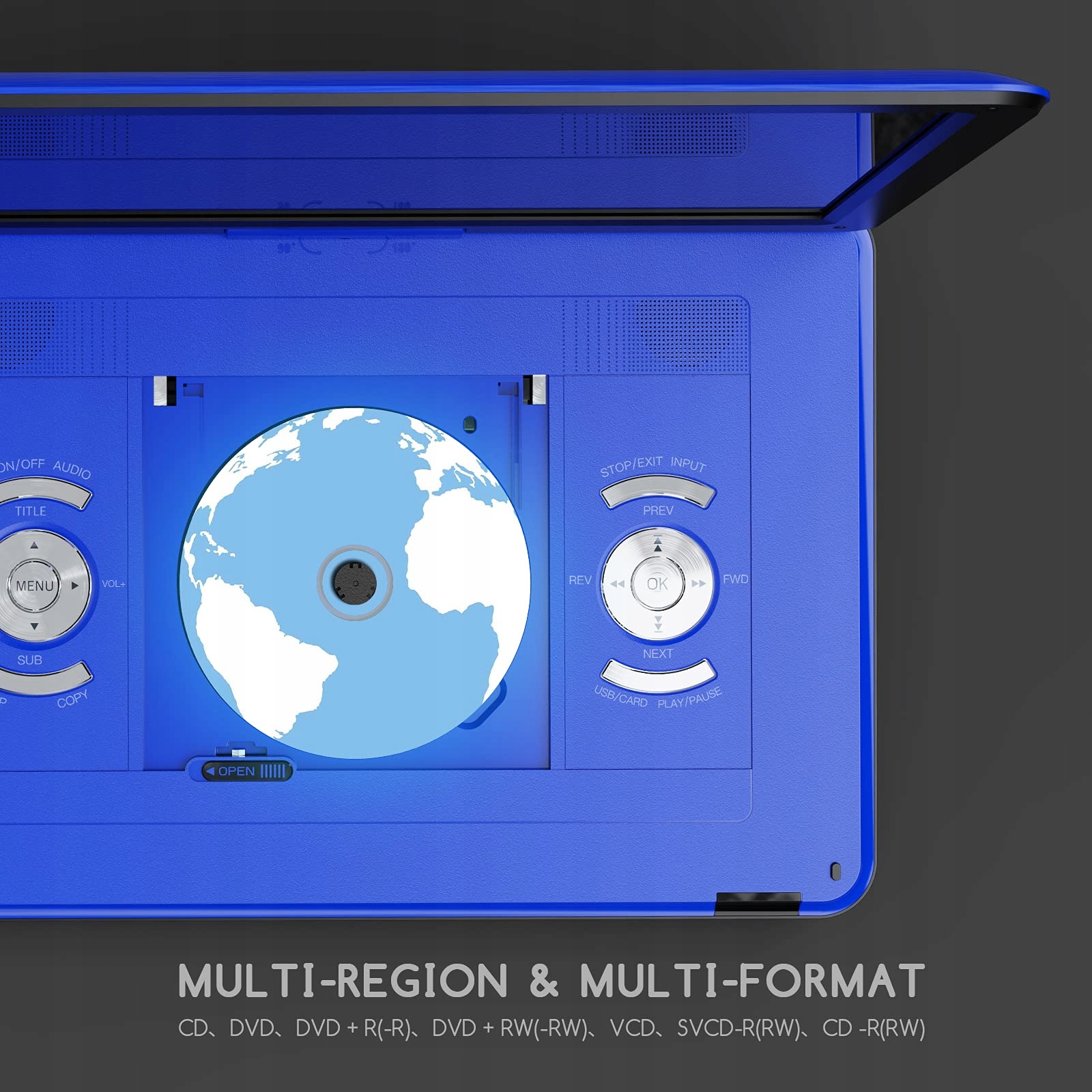 Цей 17,9-дюймовий портативний DVD-програвач із великим екраном має 15,6-дюймовий широкоформатний екран із вищою на 30% яскравістю, що забезпечує більш комфортний перегляд і зменшує напругу очей під час перегляду фільмів довго. Портативний дитячий DVD-програвач підтримує обертання на 270° і може повертатися на 180°, перетворюючись на автомобільний телевізор, показуючи зображення в різних напрямках для зручного перегляду з різних ракурсів.