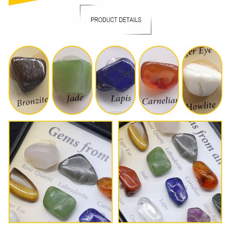 На фото показано приклад набору з 15 мінералів, відполірованих у шліфувальному барабані.