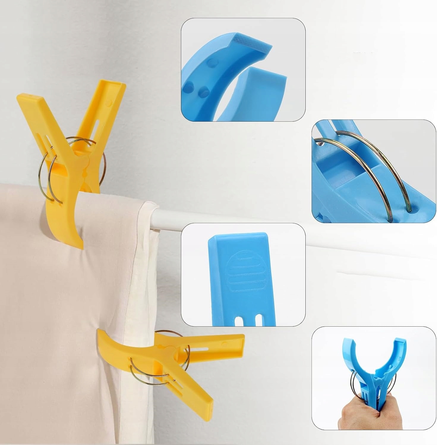 - Мінімалістичний і міцний дизайн: Легкий, міцний, портативний затиск для пляжних рушників. Міцні кліпси для ковдри з вітрозахисним і протиковзким дизайном. Міцні губки та пружини забезпечують чудову силу утримання.