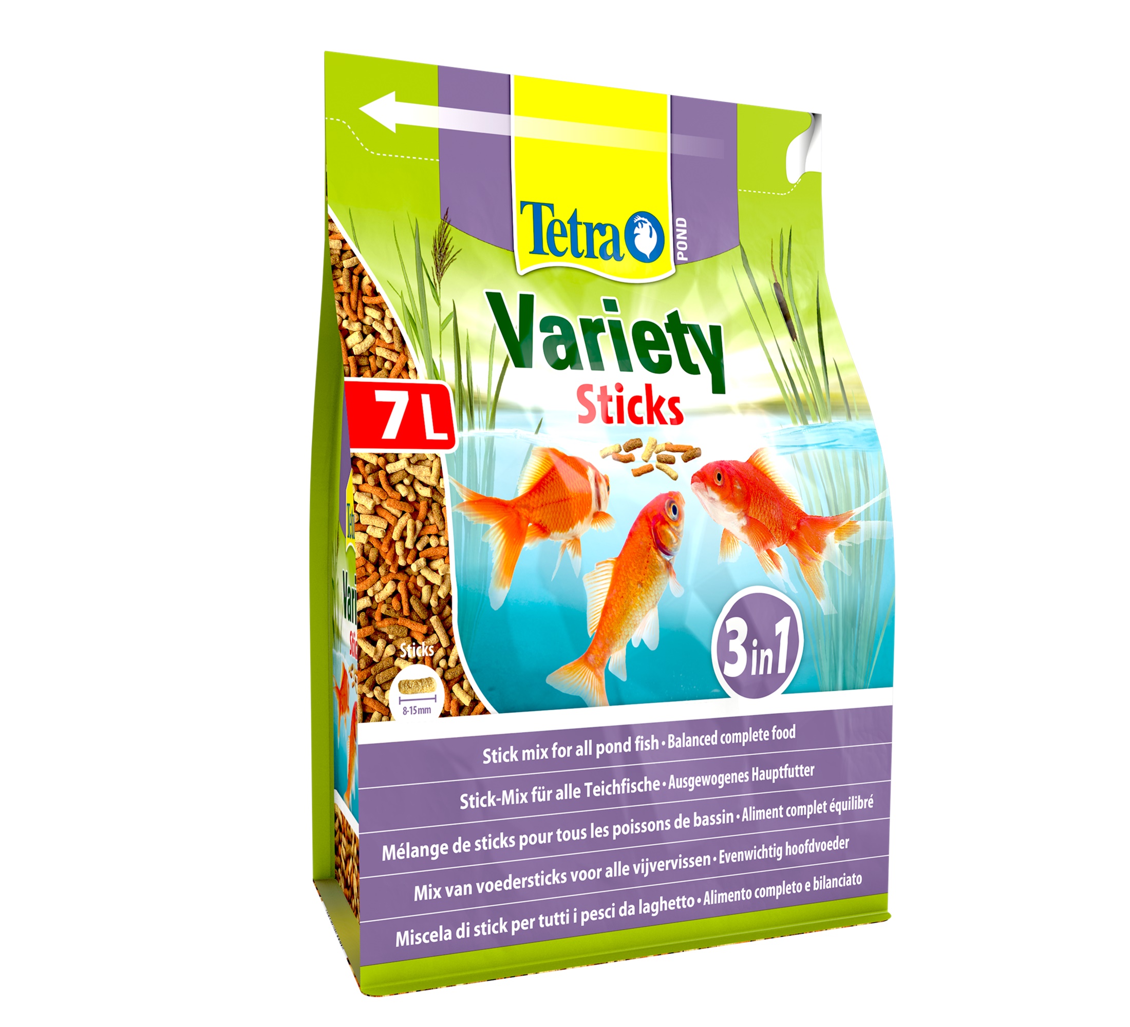 Суміш із трьох видів корму в стіках забезпечує поживний і різноманітний раціон для риб у водоймах і ставках.