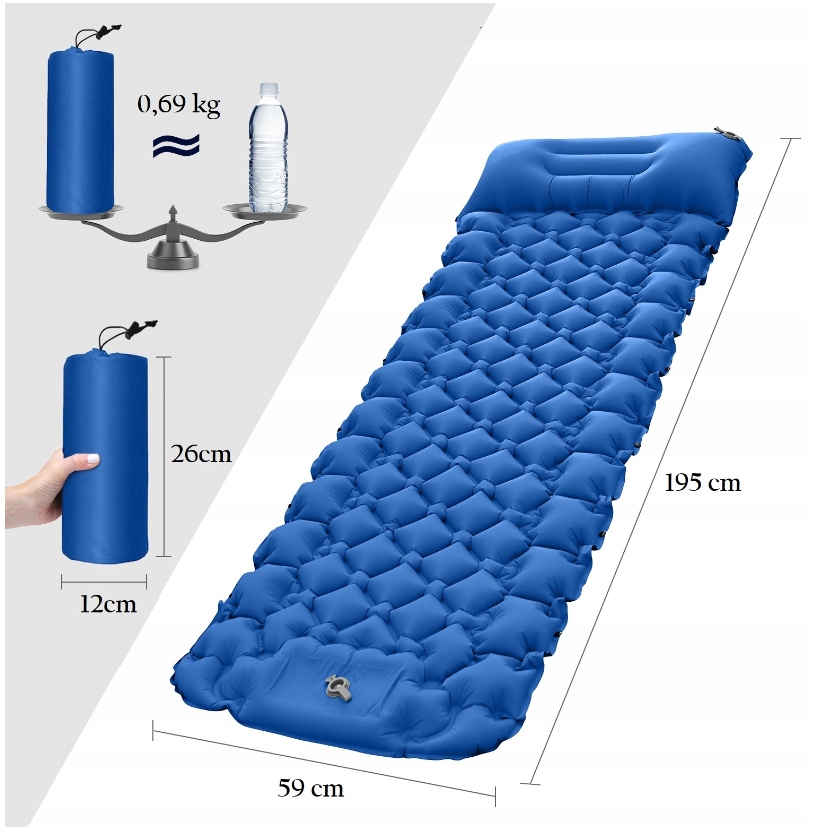 4 Завдяки цьому ви отримуєте гнучкість і вирішуєте, коли вам потрібно взяти з собою матрац з 1-ї людини, а коли подвійний.матраци невеликі, легкі та компактні, ідеальні як килимок або килимок для сну. Незалежно від того, де ви знаходитесь - на бівуаку, поїздці, пляжі, саду чи навіть вдома - наш матрац незамінний. У ньому є побудований насос, тому вам не потрібно турбуватися про додаткові аксесуари. Завдяки своїм компактним розмірам це зручно транспортувати і ідеально підходить для землі під наметом під час кемпінгу, особливо влітку, коли проходять фестивалі, концерти на свіжому повітрі та поїздки до лона природи - як до гір, до моря, або до озера.