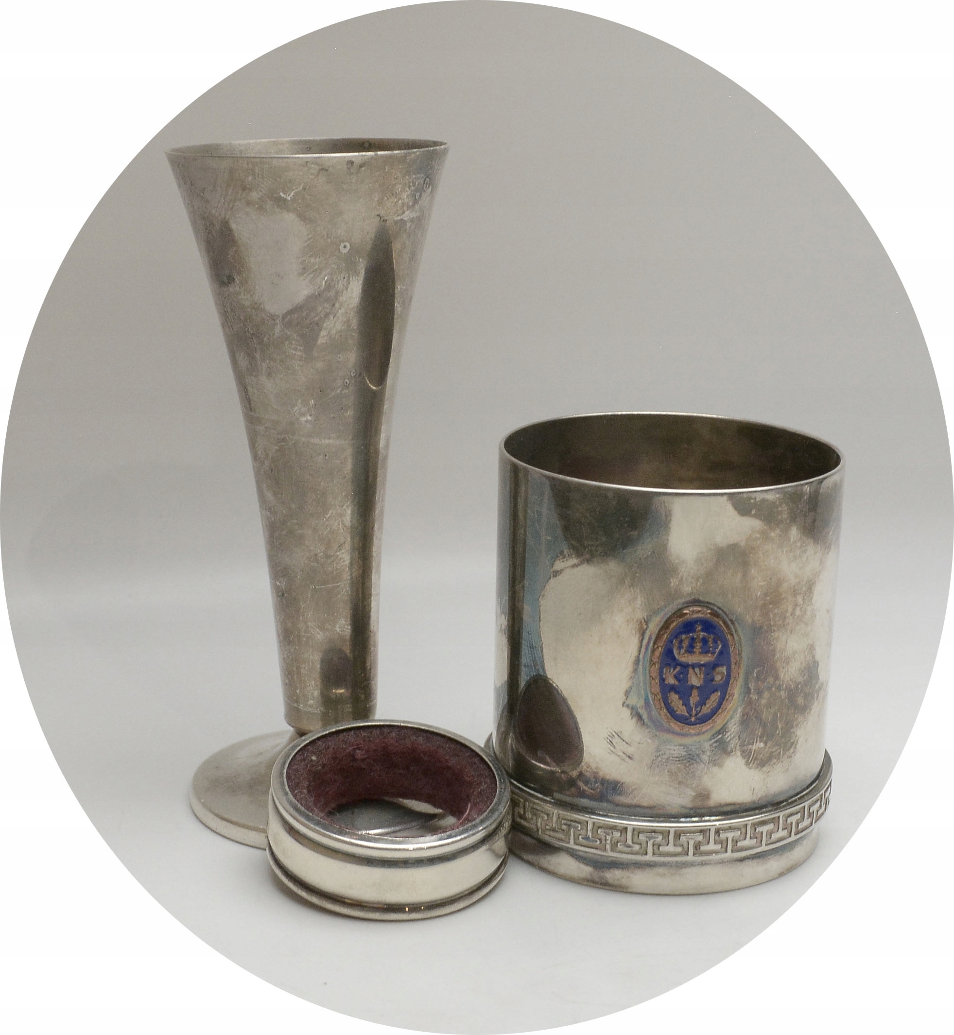 - Опис: В набір входить: 1. Чашка з логотипом K.N.S. - висота прибл. 7 см, діаметр прибл. 6 см, бруд на синій емалі, підписана; 2. Кільце - серветниця/прикраса штори (?), діаметр бл. 4, ширина бл. 14 мм, внутрішня підкладка з фетру червоного кольору; 3. Ваза (з начинкою) - висота бл. 12 см, діаметр прибл. 5,3 см (основа) х 4,9 см. Незначні сліди використання. Чудовий подарунок для справжнього знавця.